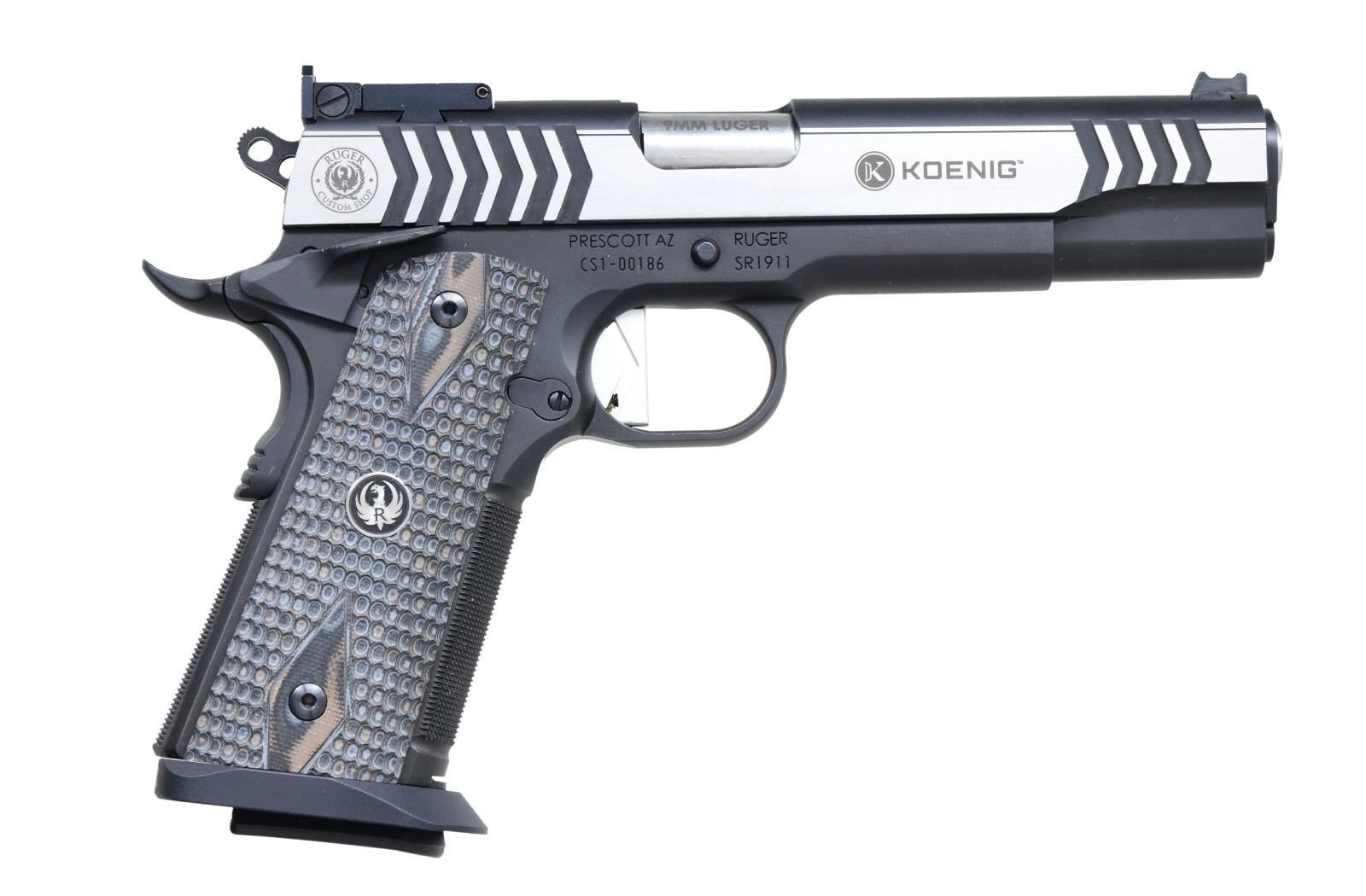 PISTOL. Cal. 9mm Luger. S# CS1-00186. Bbl. 5", competition stainless with polished integral feed ramp, target crown, hand-fitted locking lugs, and 1:16" slower twist rate for increased accuracy using lighter weight match bullets plus a full-length guide rod. Mfg. 2018 as Custom Shop Model 06766 has black nitride-finished stainless construction with polished stainless sides of slide. Current MSRP is $2,849. Abundance of Custom Shop features to include: Hogue Piranha G10 grips, Allen head grip screws, fiber optic front sight with replaceable light pipes, fully adjustable rear sight with beveled edges and serrated face, hand fitted slide (tight and smooth), Chevron cocking grooves on slide, chevron profiled skeletonized flat faced trigger having pretravel adjustment on bow, 25 LPI front strap with high cut under extended magazine release, matching checkered flat mainspring housing, integral plunger tube, extended ambidextrous safety, Cylinder & Slide Shop sear spring and precision machined disconnector, Koenig Shooting Sports skeletonized low mass hammer, TechWell machined aluminum flared magazine well with Ruger marking, lightly lowered and enlarged ejection port, and frame-matched beavertail grip safety with memory pad. Very special Ruger from its newly formed Custom Shop. MAGS: 2 factory 10 rd. with push-button bumper pads. UNATTACHED ACCESSORIES: Special factory Custom Shop (CS) black plastic case with CS accessories to include a CS folder with an authenticity card and a CS challenge coin. CONDITION: all aspects are near excellent with a new, unfired appearance. (23-6167/NW). MODERN. $1,200-1,800.