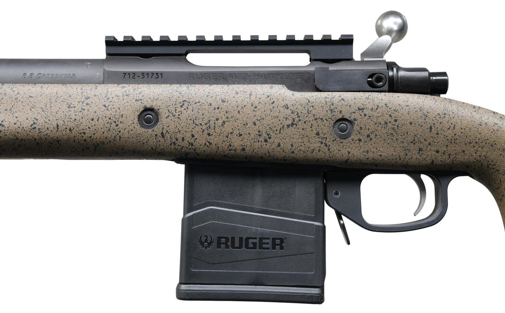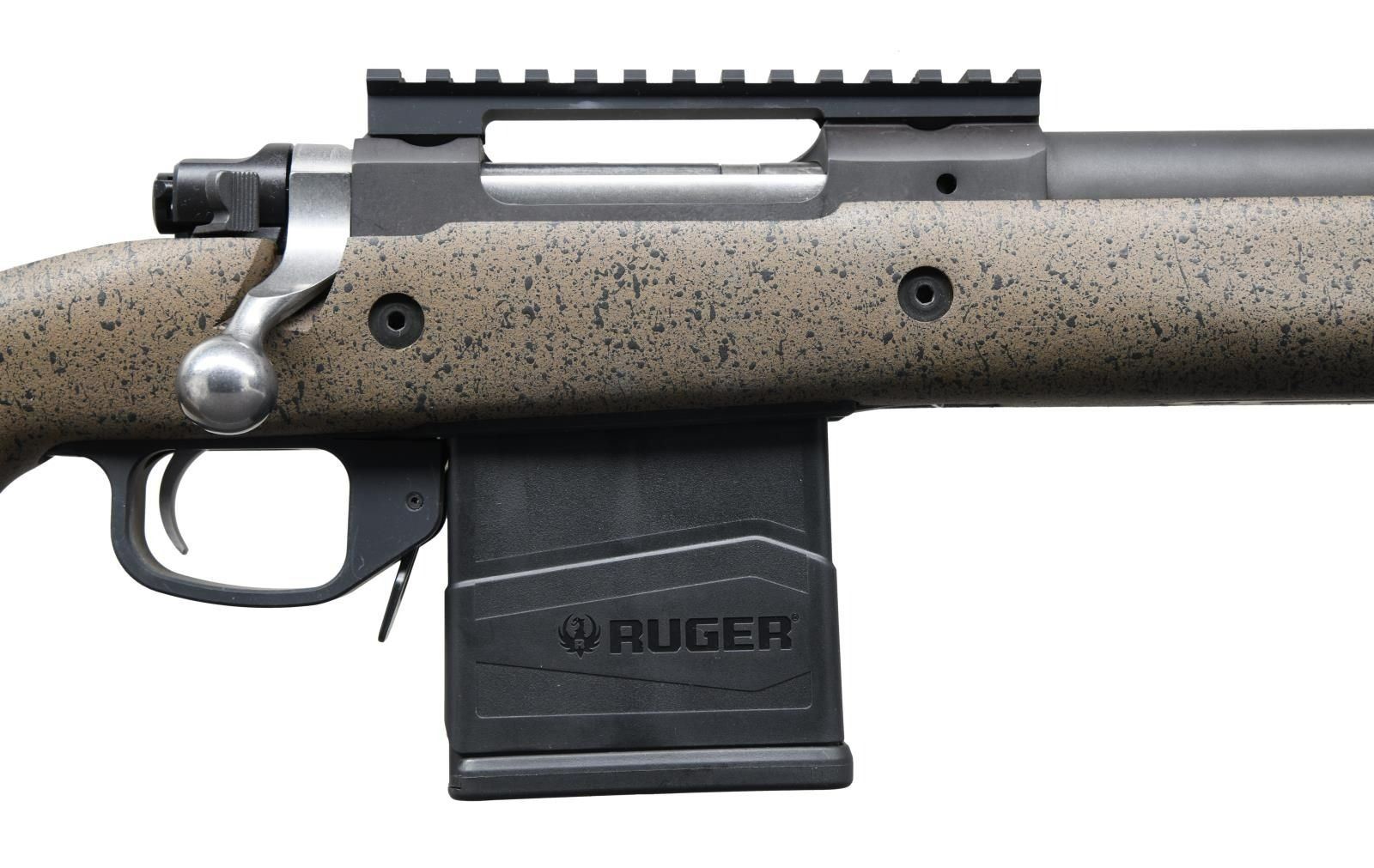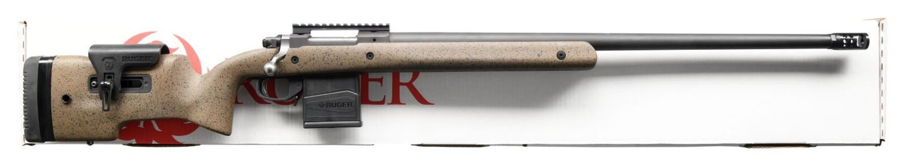 RIFLE. Cal. 6.5 Creedmoor. S# 712-51731. Bbl. 26" heavy target with 5/8"-24 Precision Rifle Hybrid Muzzle Brake; no provision for sights. Mfg. 2020 as Model 47184 with matte finished metal in fully adjustable Ruger splatter painted stock (grey base, black splatter) having M-Lok flush fitted rail. Receiver milled for standard Ruger rings plus fitted with Ruger 20 MOA Picatinny base secured by four 8-40 screws. Rifling is 1 in 8 RH 5R plus factory 2 stage adjustable trigger. Current MSRP is $1,619. MAGS: 1 factory 10 rd. UNATTACHED ACCESSORIES: w/box. CONDITION: all aspects near excellent (including bore) with new appearance. PROVENANCE: The Collection of Gun Sport Ltd owned by Jon R. Thomas. (23-3682/NW). MODERN. $800-1,200.