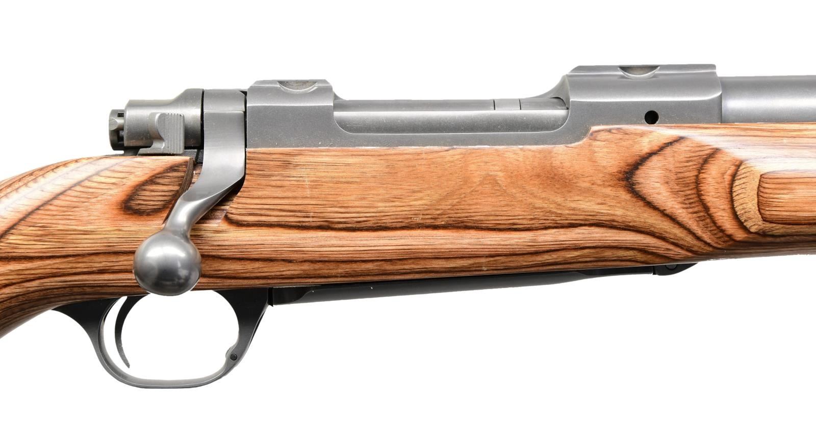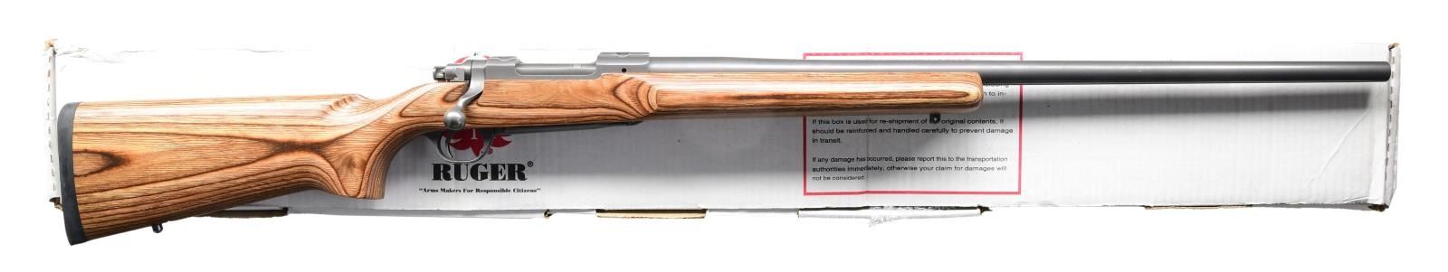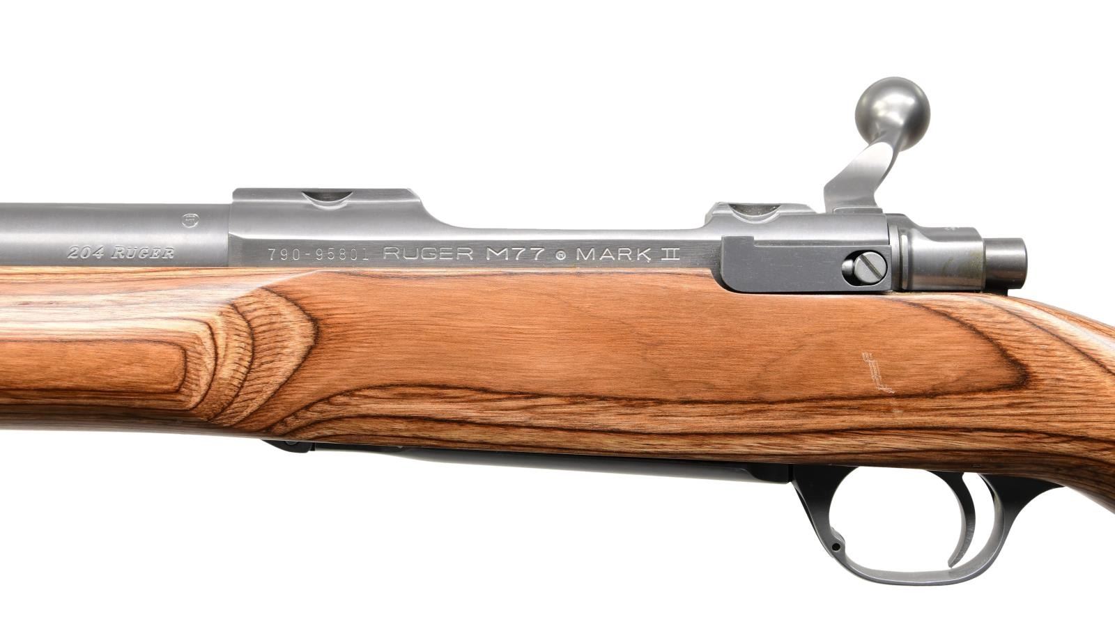 BOX. Cal. 204 Ruger. S# 790-95801. M77 Mark II bolt-action rifle mfg. by Ruger in 2004. Top of the bbl. is marked with Ruger's mfg. information, with the cal. designation marked on the left at the breech. Metal components exhibit a dark gray finish overall. Laminated wood pistol grip buttstock with a Ruger logo black rubber recoil pad. UNATTACHED ACCESSORIES: factory box. CONDITION: excellent, with metal components retaining bountiful amounts of their original factory finish, exhibiting some light superficial handling marks overall. Mirror bore, exhibiting well-defined rifling throughout. Stock exhibits some scattered marks and impressions from handling and storage overall. Box shows exterior wear and some tearing, but otherwise remains sturdy and serviceable. Box end label exhibits wear, and S# is no longer legible. (23-6462/MLW). MODERN. $400-600.