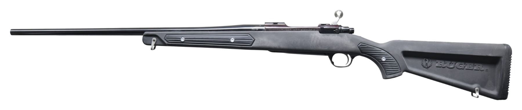 Cal. 7mm-08. S# 788-44050. Bbl. 22". Receiver has integral scope bases. Ruger catalog # MK77RP MKII & model #07972 M77 Mark II made in 2001. Blued finish. Zytel paddle skeleton black stock with bottom mounted sling hardware. UNATTACHED ACCESSORIES: matching numbered factory box with manual, trigger lock & set of blued Ruger rings. CONDITION: stock shows scattered light scuffing & handling marks. Metal retains 99% blue with a couple minor specks of light oxidation. Action functions properly when hand cycled. Near excellent bore. (24-3288/MJC). MODERN. $300-500.
