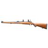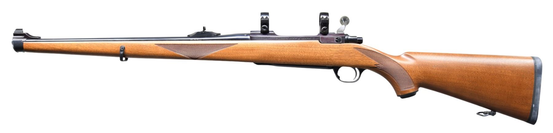 Cal. 30-06. S# 784-55917. Bbl. 18 1/2" with user changeable brass bead front sight on banded ramped base; folding leaf rear sight on raised base. Mfg. 1996 (1989-2006) having wing safety on action that is also factory machined for its attached 1" scope rings. Blued finish to include its steel triggerguard; black alloy floorplate. Checkered full length mannlicher stock with Ruger eagle grip cap, sling provisions and black rubber buttpad. CONDITION: all aspects near excellent including bore. (25-3754/NW). MODERN. $500-750.