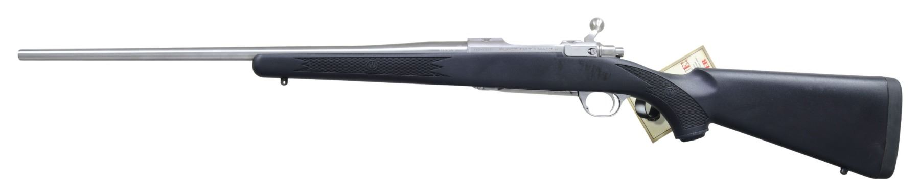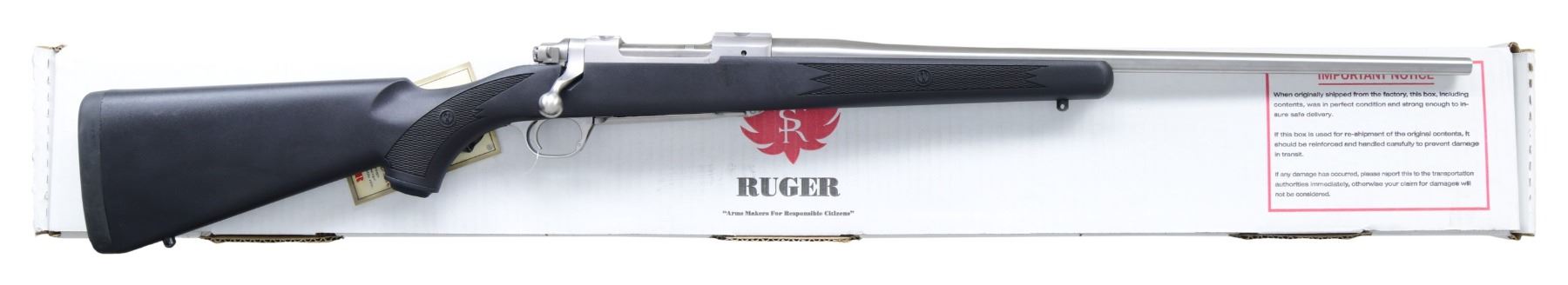 Cal. 270 WSM. S# 792-02356. Bbl. 22". Receiver has integral scope bases. Ruger catalog # KM77RFP MKII & Model 17839 made in 2006. Stainless finish. Black synthetic pistol grip stock with bottom mounted sling studs & factory recoil pad. LOP: 13 3/4". UNATTACHED ACCESSORIES: matching numbered factory box with manual, paperwork, set of stainless Ruger rings & trigger lock. CONDITION: all aspects near excellent with factory hang tag present on trigger guard. (24-3395/MJC). MODERN. $400-600.