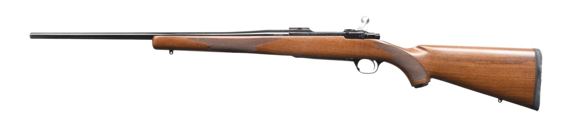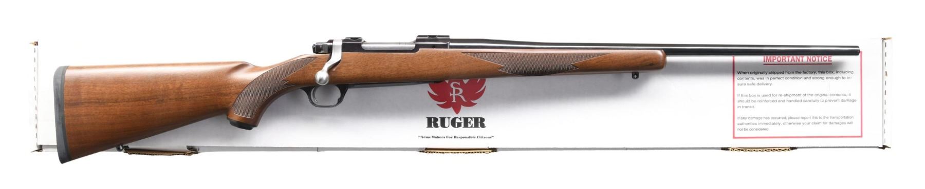 FACTORY MODEL 17841 BOX. CAL.270 WSM. S# 790-48108 (mfg. 2004). Barrel 22". Receiver has integral bases. Checkered walnut stock with Ruger grip cap & black pad. UNATTACHED ACCESSORIES: matching factory box with packaging including Ruger rings. CONDITION: all aspects near excellent with receiver having a plum tone; near excellent bore. (23-6844/MD). MODERN. $400-600.
