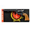 Cal. 22 Mag / 22 LR. S# 325903. Bbl. 6 1/2" w/ semi circular front blade & windage drift adj. rear on top strap. Mfg. 1961 (1959-1964) w/in 300,000 S# range & singular bbl. length. First of convertibles w/ addition of 22 LR auxiliary cyl. First variation w/ XR3 grip frame having optional varnished walnut grips (normal was checkered hard rubber) & black eagle medallions. Original lockwork w/out factory safety update. Steel ejector rod housing. UNATTACHED ACCESSORIES: near excellent original box (sm. spot of yellow paint on lid) w/ shipping sleeve indicating optional walnut grips. Complete paperwork to include hang tag noting moly steel frame. Auxiliary 22 LR cyl. & red felt bag. CONDITION: overall near excellent w/ couple of very faint marks & light firing residue. Near excellent bore & grips. (22-3133/NW). CURIO. $450-650.