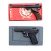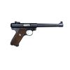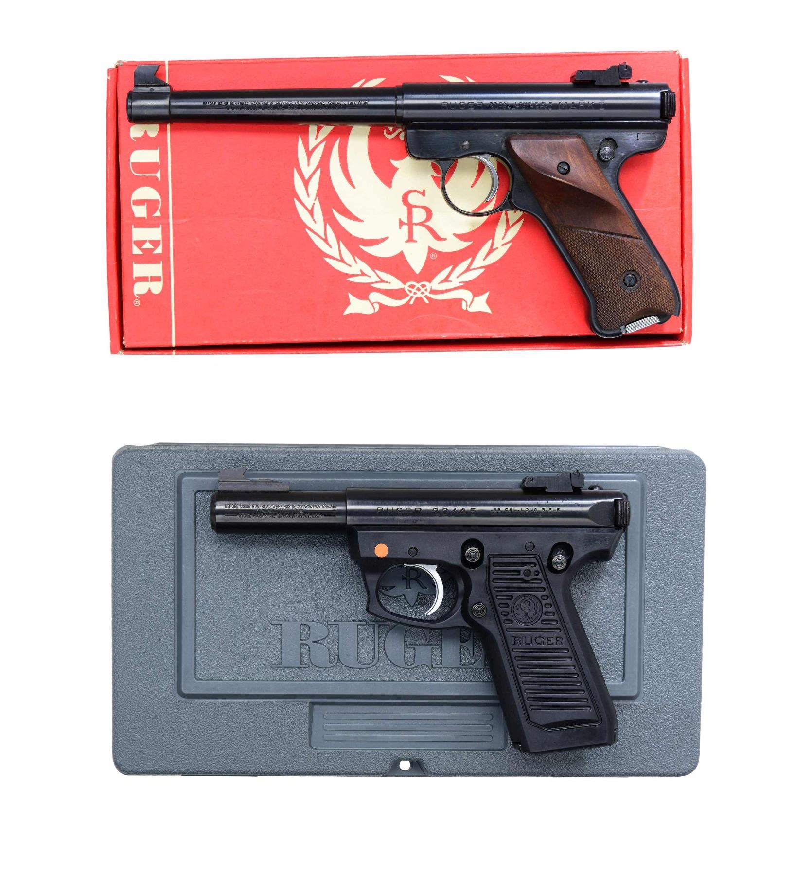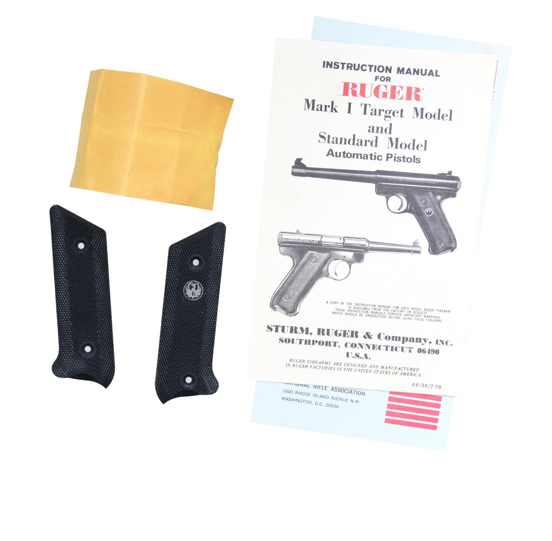 PISTOLS. 1) MARK I TARGET WITH MATCHING BOX. Cal. 22 LR S# 15-42561. Mfg. 1979 as Catalog No. T-678. Blued finish. Bbl. 6.875". Checkered walnut grips with thumb rest on left panel & Ruger medallion on right panel. MAGS: 1-9 Rds. UNATTACHED ACCESSORIES: Factory box and packaging. CONDITION: Very good overall showing light wear; bore is bright and sharp. (24-2891/MD)