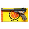 Cal. 22 LR. S# 336007. Bbl. 6 7/8" tapered heavy target with undercut square faced front blade and factory receiver mounted adjustable rear. Mfg. 1968 as T-678 with large serial numbers, chrome trigger and checkered factory walnut RH thumbrest target grips having black eagle medallion. MAGS: 2 factory 9 rd.; charging slot only on right. UNATTACHED ACCESSORIES: original white spare magazine box (missing end flap tab), 1-16-67 manual and very good matching numbered 2 piece yellow box marked "TARGET PISTOL" without barrel indication (light edge scuffs). CONDITION: all aspects near excellent including bore and grips. (22-6180/NW). CURIO. $350-500.