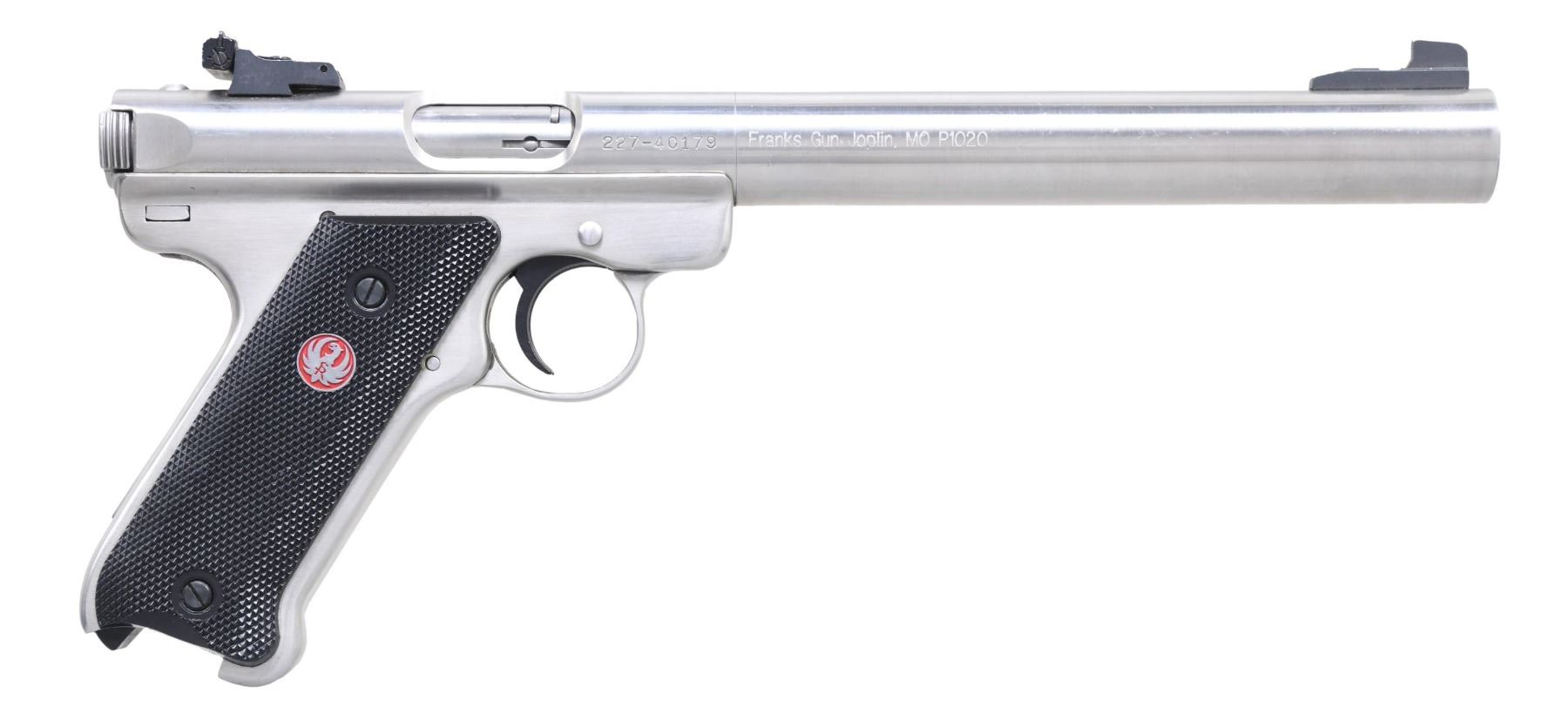INTEGRAL FRANKS GUN SILENCER. Cal. 22 LR. S# (Silencer): P1020, (Pistol): 22740179. Bbl. 7 7/8" (with silencer). Ruger Mark III Target semi-automatic pistol mfg. by Ruger in 2006, and subsequently fitted with a Franks Gun integral silencer. Left side of the receiver is marked with the model and cal. designations, with the S# marked on the right. Right side of silencer is marked "Franks Gun Joplin, MO P1020". Receiver, frame, and silencer exhibit a polished in-the-white finish. Frame is mounted with 2-piece Ruger medallion checkered black plastic grips. Blade front sight, with adj. square notch rear sight. Mag. is absent. CONDITION: very good, with scattered superficial marks from handling and storage present overall. Silencer shows some carbon build up front prior use, but is otherwise very good overall. Grips show some smoothing, as well as some scattered marks from handling and storage, but otherwise remain sturdy and serviceable. PROVENANCE: From the Estate of Ivan Lee Shapiro. (03-1790 / 24-6518/MLW). MODERN / MODERN CLASS III. $500-700.