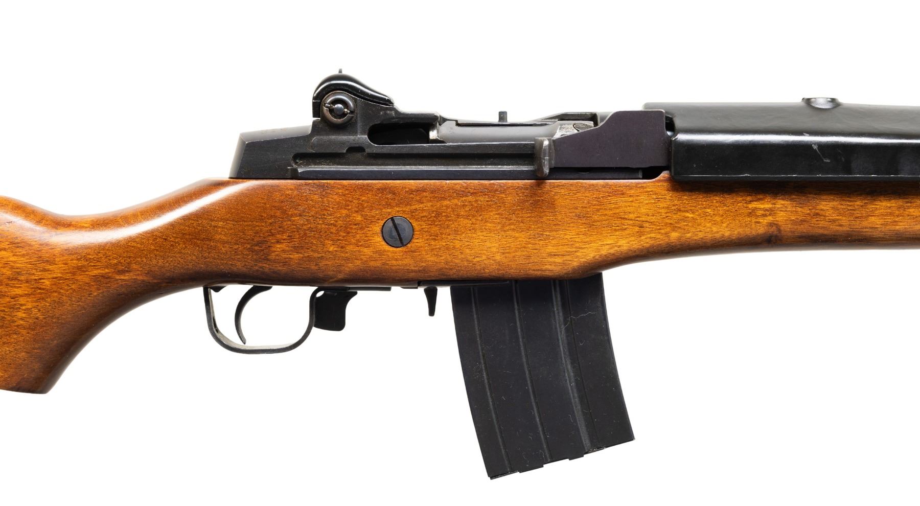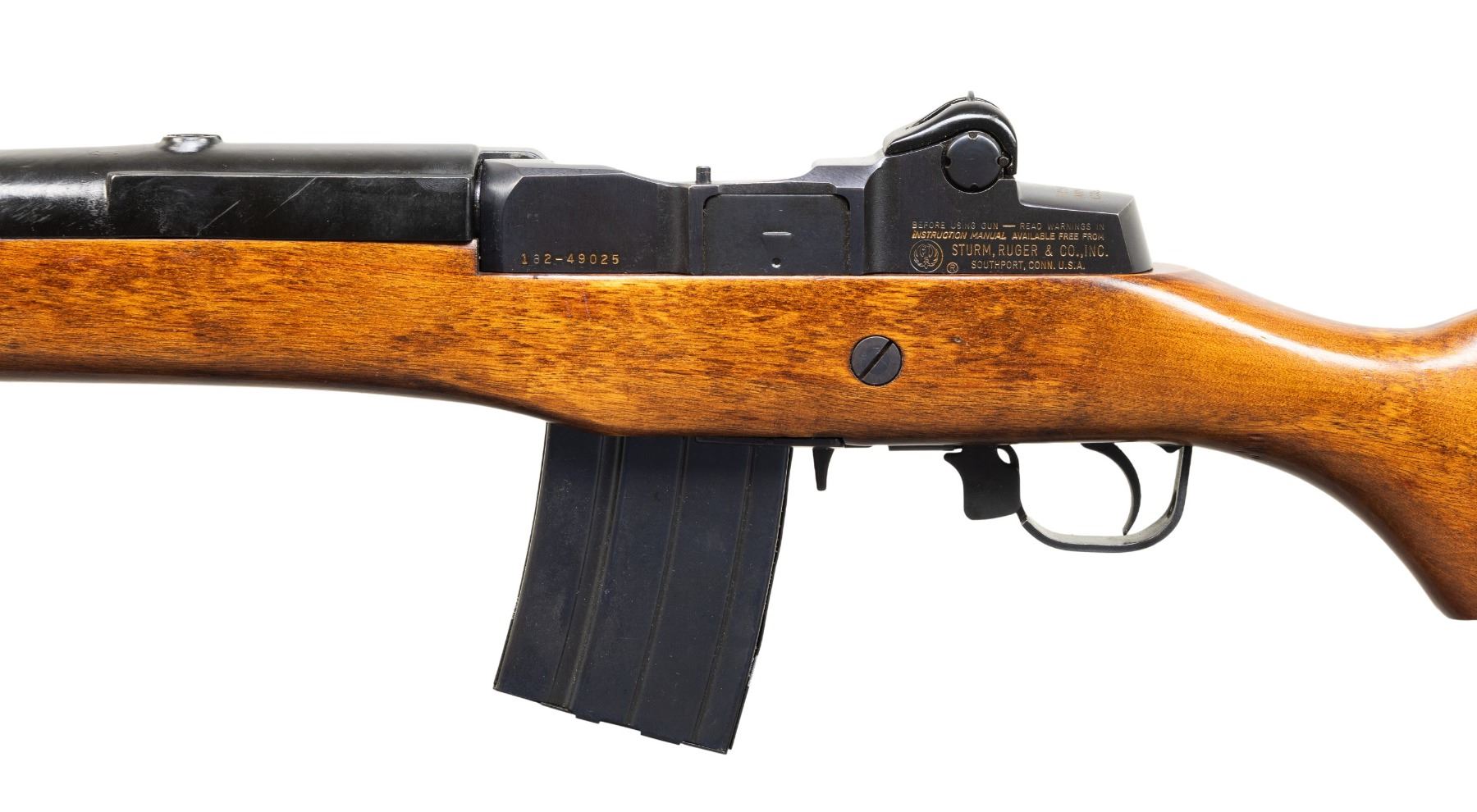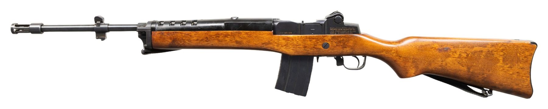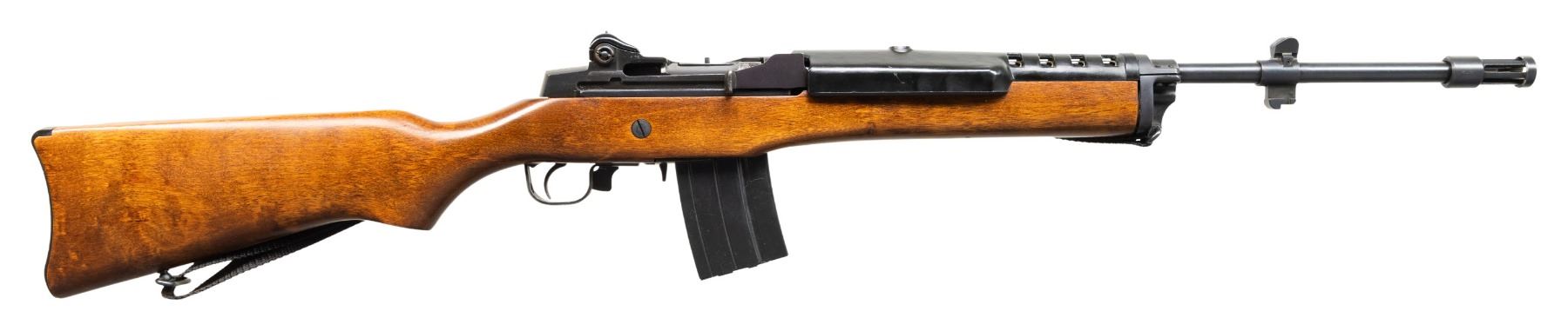 Cal. 223 Rem. S# 182-49025. Bbl. 18 1/2" with banded serrated blade front sight having protective ears plus integral bayonet lug compatible with US M-16 bayonets; birdcage flash hider at muzzle and factory receiver sight at rear. Mfg. 1981 (1974 to date for all Mini's) with walnut stained birch carbine stock having Celcon buttplate, factory black fiberglass handguard, sling swivels and simple black nylon sling as originally packed with the firearm. Blued finish with added attractive Bonanza Gold filling its factory stamped markings. Originally intended for government sales as indicated by "G" in its model designation; "20" meant it was shipped with a 20 rd. magazine and "B" was for bayonet lug. MAGS: 6 TOTAL: 3 near excellent factory mags (1 of 20 rd. and 2 of 30 rd.) plus 3 good aftermarket 30 rd. CONDITION: some very light occasional stock handling marks; all other aspects near excellent including bore. (25-4798/NW). MODERN. $750-1,000.