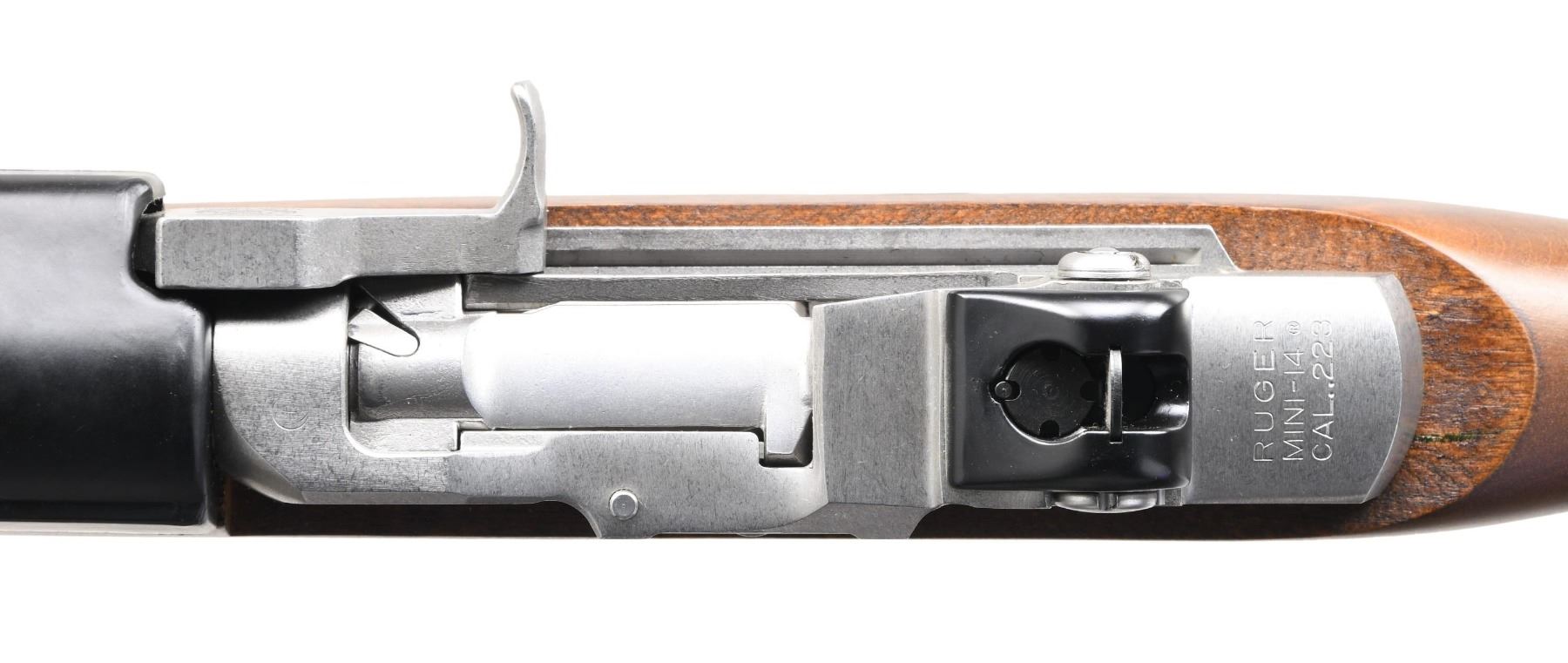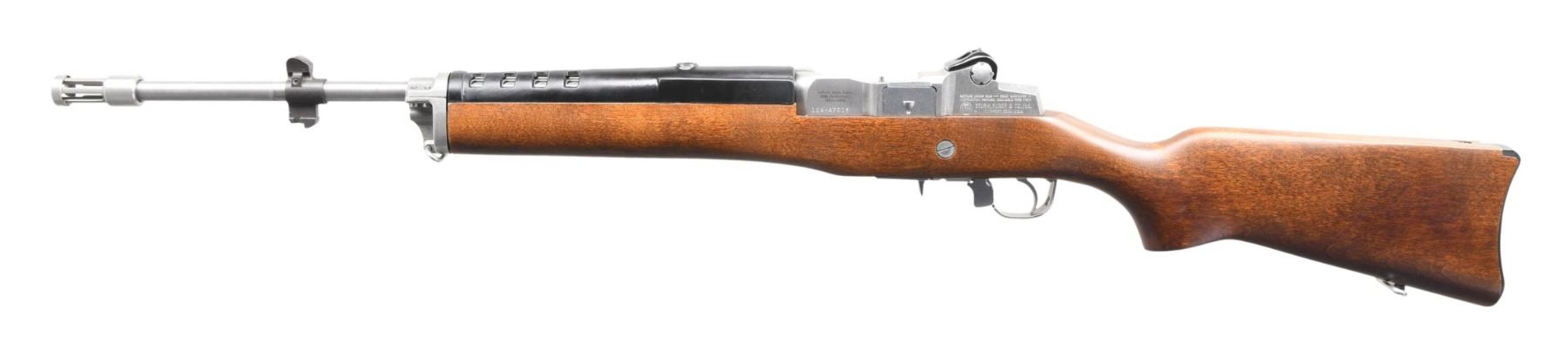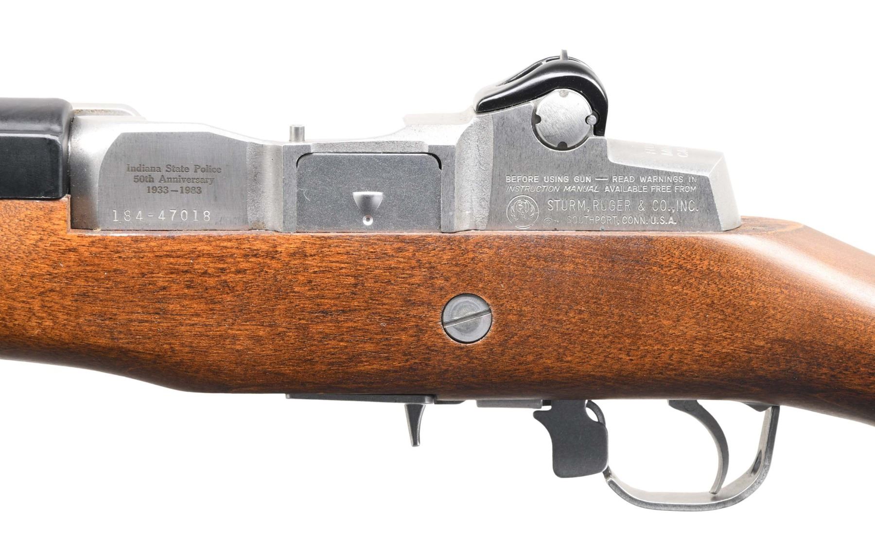 ANNIVERSARY SEMI AUTO RIFLE. Cal. 223 Rem. S# 184-47018. Bbl. 18 1/2" with flash hider. Blade front sight w/ protective ears & bayonet lug. Aperture rear sight. Mfg. 1983 to commemorate the 50th anniversary of the Indiana State Police. Right side of charging handle marked with Indiana State Police logo. Left side of receiver marked "Indiana State Police 50th Anniversary 1933-1983". Stainless finish. Birch stock with black synthetic handguard & bottom mounted sling swivels. Right side of butt has Indiana State Police commemorative coin. MAGS: none present. CONDITION: all aspects near excellent. (23-6318/MJC). MODERN. $500-750.