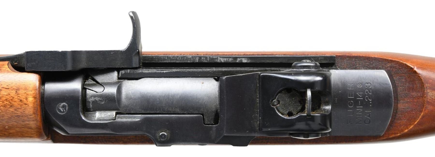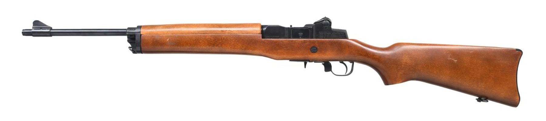 Cal. 223 Rem. S# 181-12438. Bbl. 18 1/2" with banded serrated blade sight plus receiver mounted adjustable rear. Mfg. 1978 (1974 to date) with blued finish and stained hardwood stock set to include handguard; black plastic carbine buttplate. MAGS: 1 factory 5 rd. CONDITION: very good overall with numerous light marks on stock set. Metal finish has light marks in front sight area plus wear spot on receiver over chamber resulting from prior no drill scope mount. Near excellent bore. (23-6323/NW). MODERN. $500-750.