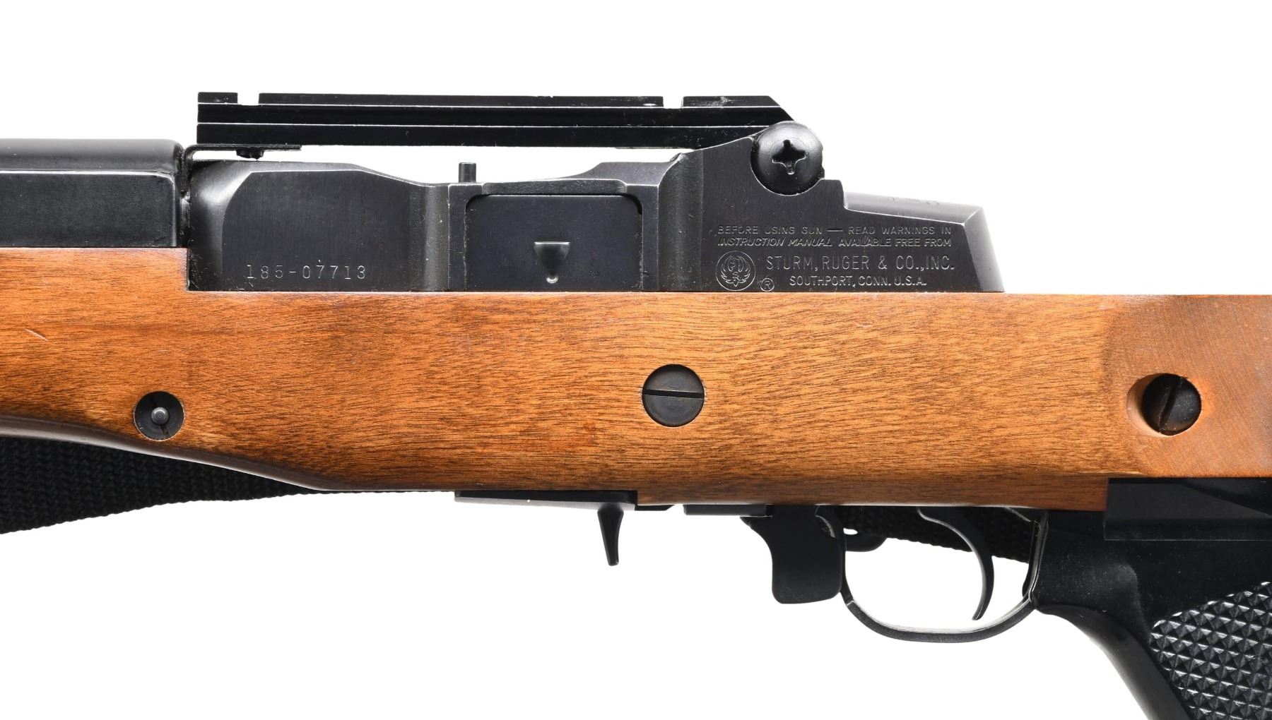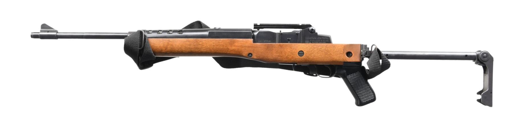 Cal. 223 Rem. S# 185-07713. Bbl. 18". Ramped blade front sight. Receiver mounted Weaver scope mount. No rear sight present. Mfg. 1984. Blued & anodized finishes. Factory birch folding stock with left side sling swivels & black nylon sling. MAGS: none present. CONDITION: stock set shows some scattered handling marks. Metal retains 97% blue & anodized finishes w/ some operational wear on bearing surfaces. Action functions properly when hand cycled. Very good bore. (23-6314/MJC). MODERN. $400-600.