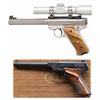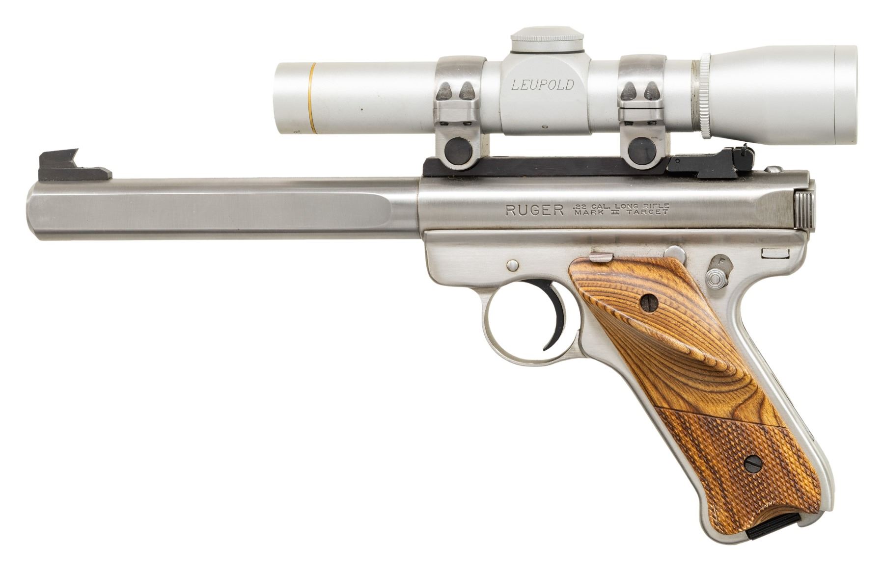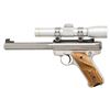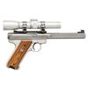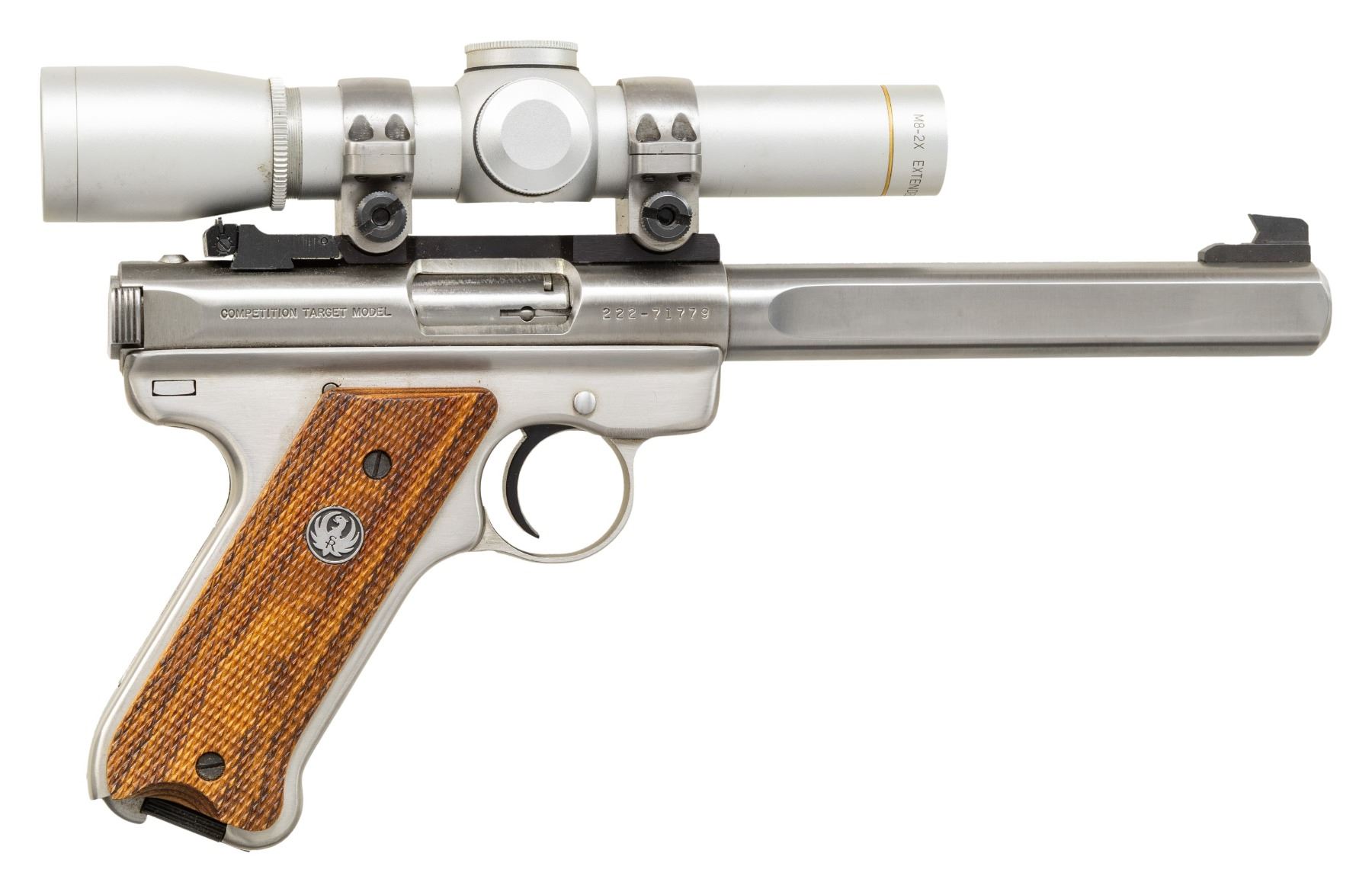 1). RUGER STAINLESS MARK II COMPETITION TARGET MODEL. S#222-71779. Bbl. 6 7/8" slab sided bull with recessed target crown and screw attached blued undercut target front sight. Receiver drilled and tapped for its Ruger blued steel scope mount machined to accept its stainless 1" matching scope rings; black factory adjustable rear sight. Fitted with Leupold M8-2X IER silver finished scope having Duplex reticle. Checkered laminated hardwood grips with RH thumbrest and silver eagle grip medallion. Mfg. 1999 (1992-2004) as Model 00186 with catalogue designation KMK-GC. (25-4619/NW). MODERN.