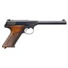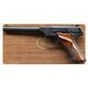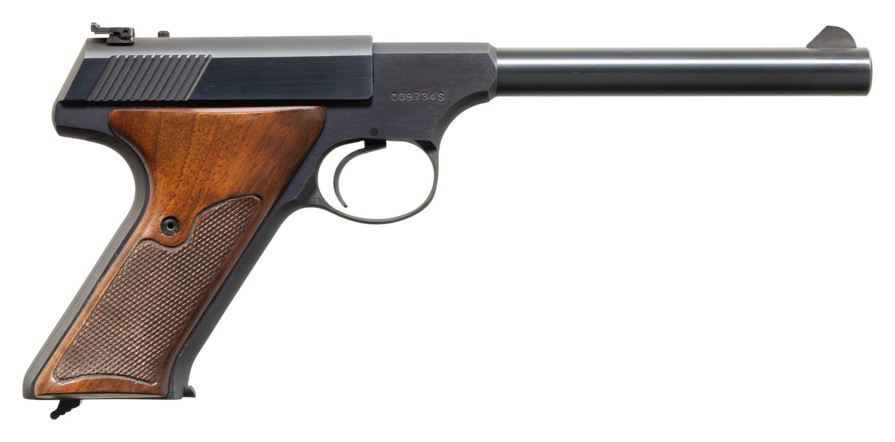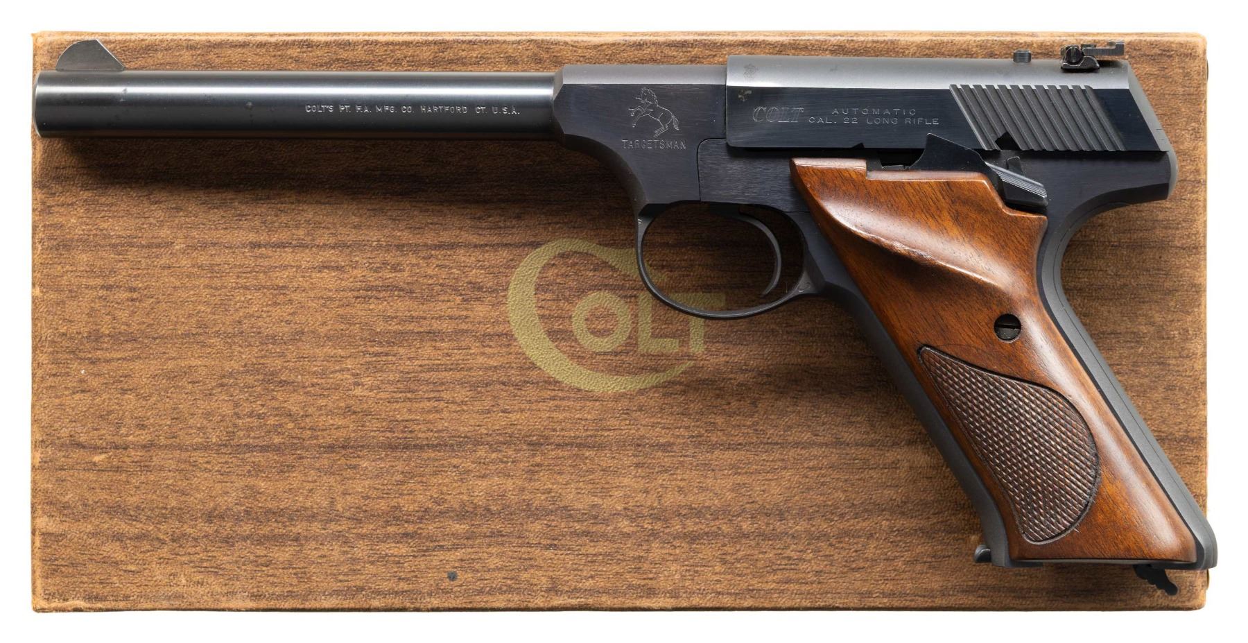 2.) COLT TARGETSMAN. S#009734S. Bbl. 6" (only length offered) with serrated blade front sight; factory adjustable rear on slide. Mfg. 1968 (1959-1977; 65,000 units) with blued finish and checkered walnut grips having RH thumbrest. UNATTACHED ACCESSORIES: very good plus original matching numbered 2 piece wood grained box with paperwork (including unused warranty cards) and blued Colt key chain sight screwdriver. (25-4673/NW). CURIO. $1,000-1,500.