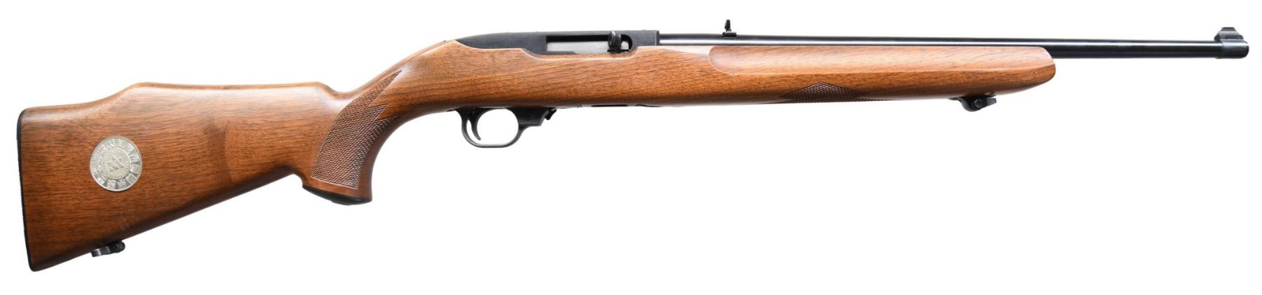 CARBINE. Cal. 22 LR. S# C1597. Bbl. 18 1/2" with brass bead front sight and folding leaf rear plus Southport address without "warning marks". Mfg. 1966 as Model SPCCC to celebrate Canada's 100th birthday in 1967. Utilizes "fingergroove" factory checkered Sporter stock having factory swivel set, grip cap and serrated plastic buttplate. Top of receiver has Centennial markings plus commemorative disk on right side of stock. Most from S# C1500 to C2008 were combined in sets (approx. 600) with matching numbered Remington Model 742 rifle. MAGS: 1 factory 10 rd. CONDITION: light marks at toe near buttplate; all other aspects near excellent including bore. PROVENANCE: Lifelong Collection of Bill Peterken. (24-6048/NW). CURIO. $250-400.