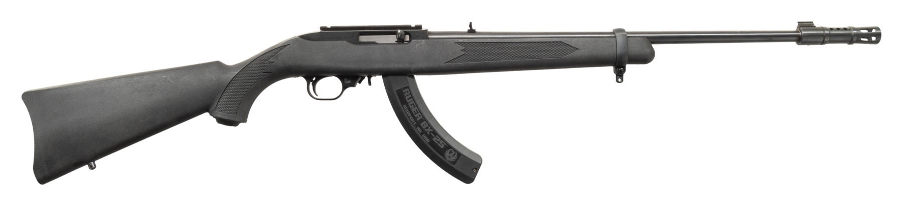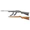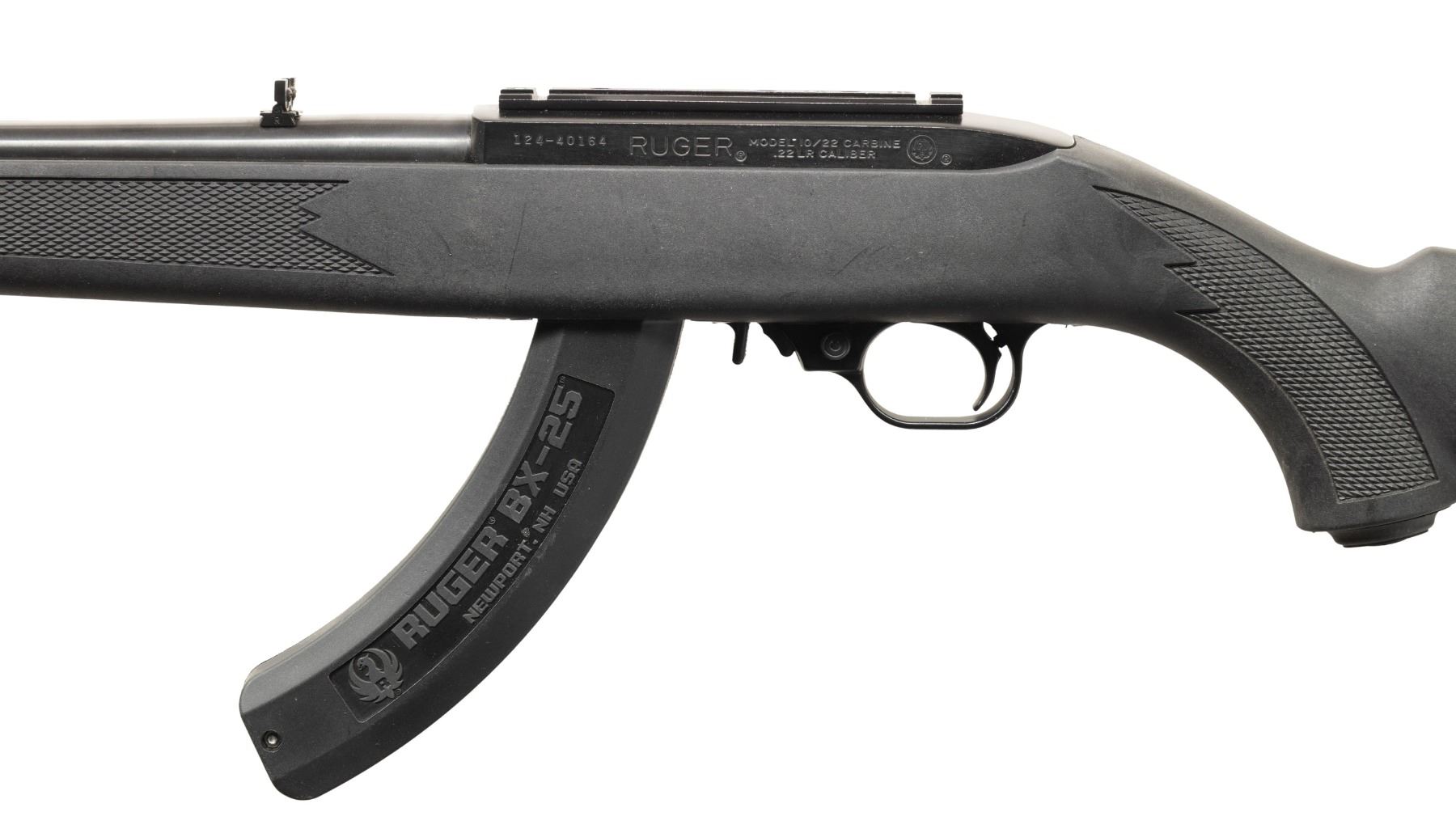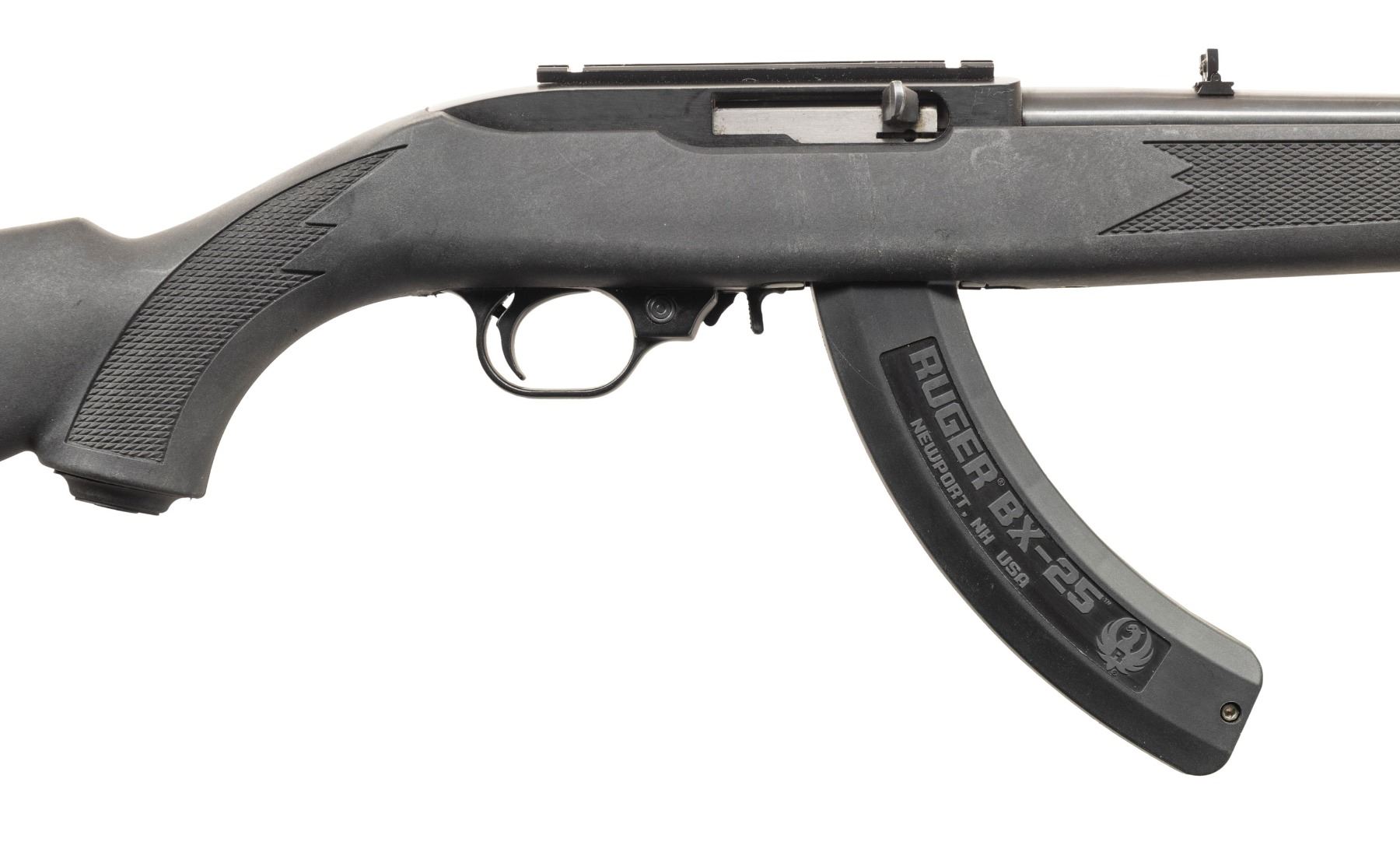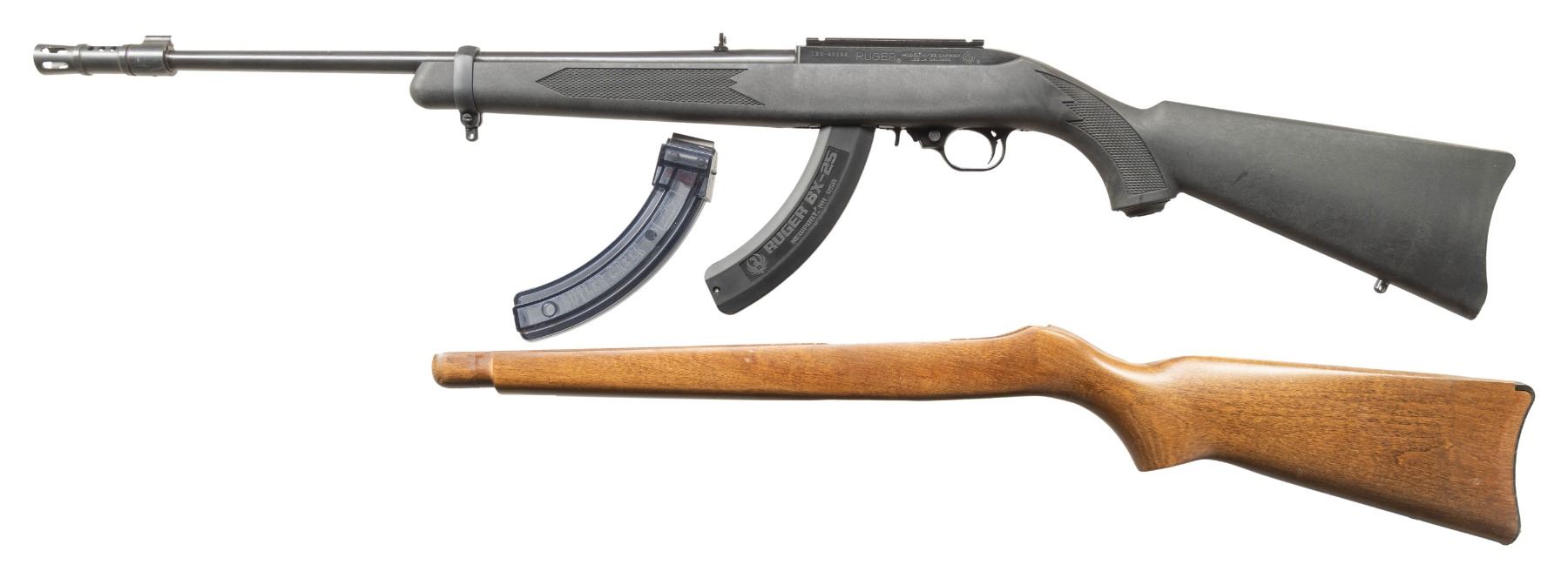 Cal. 22 LR. S# 124-40164. Bbl. 18 1/2" with factory sights of banded brass bead at front and folding leaf at rear plus aftermarket muzzle brake / flash hider. Mfg. 1983 (1964 to date) as blued model with alloy trigger housing assembly; Weaver scope base on receiver. Fitted with Ruger checkered black synthetic carbine stock having sling studs. MAGS: 2 TOTAL: Ruger and Butler Creek; each 25 rd. UNATTACHED ACCESSORIES: very good walnut stained birch Ruger carbine stock with black Celcon buttplate; missing rear sing stud. CONDITION: all aspects near excellent including bore. (25-6154/NW). MODERN. $200-300.
