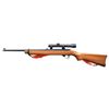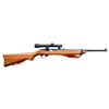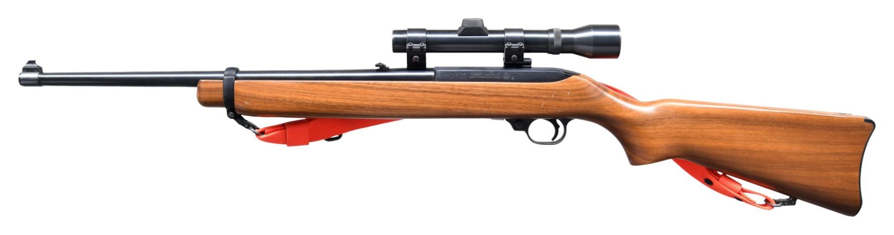 Cal. 44 Mag. S# 103-11706. Bbl. 18 1/2" w/ ramp mounted bead front sight & folding leaf rear sight. Weaver K1.5-1 gloss finished scope w/ duplex reticle on Weaver mounts. 4 rd tubular mag. Blue finish. Band fastened walnut carbine stock w/ plastic carbine buttplate. Orange nylon sling on QD swivels. CONDITION: 97% metal finish. Original stock finish shows scattered scratches & marks. Very good bore. (24-3386/DS). MODERN. $800-1,200.