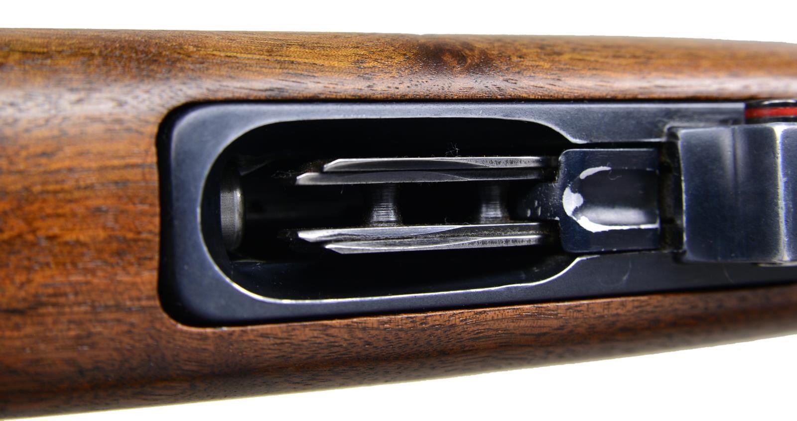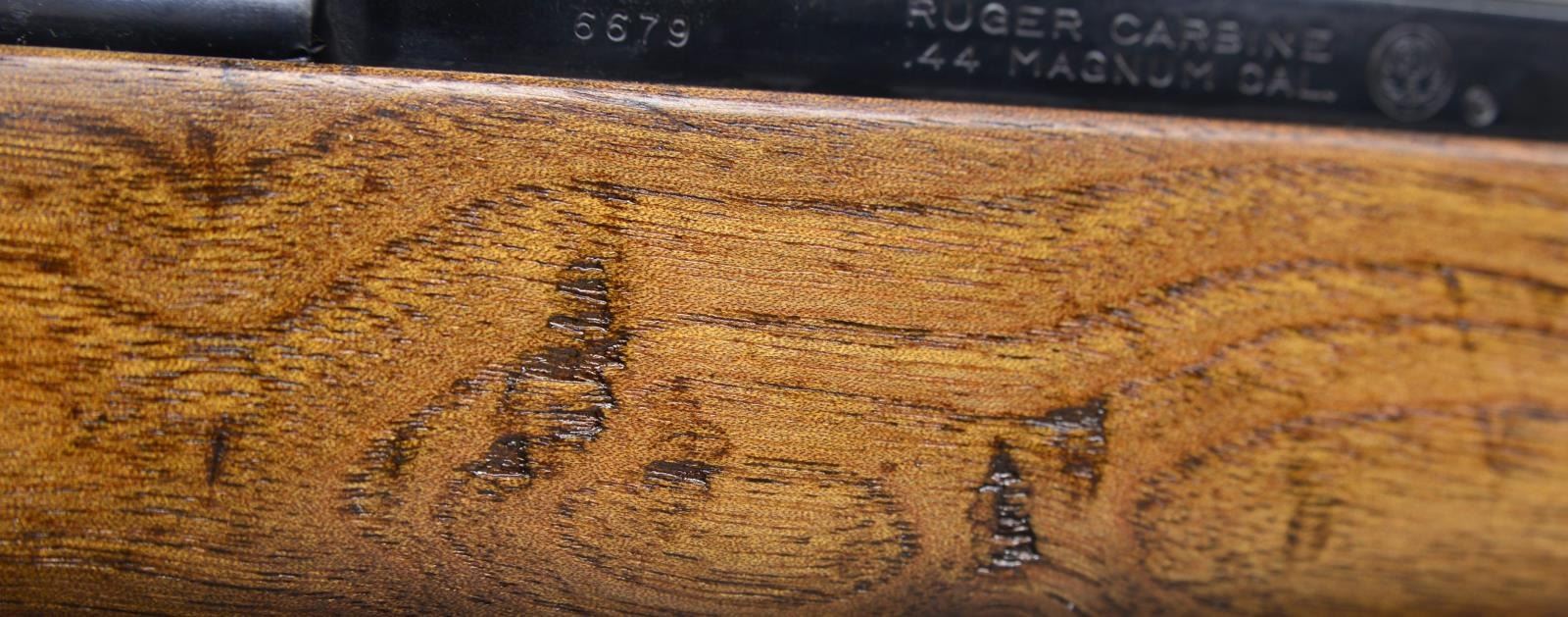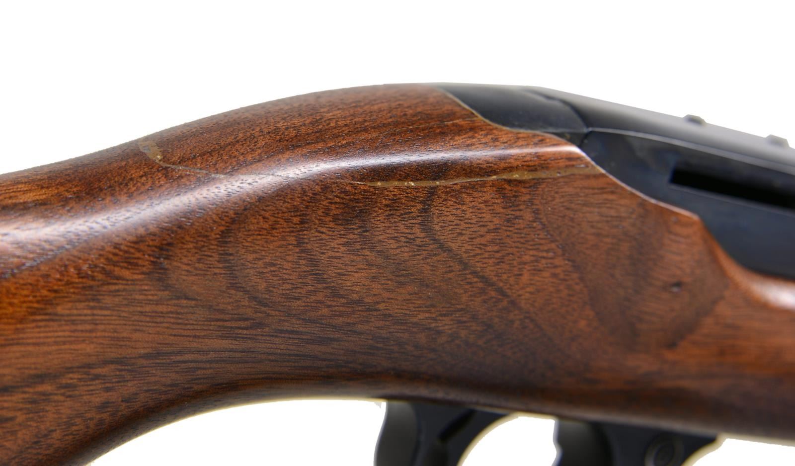 Cal. 44 Mag. S# 6679. Bbl. 18.5" w/ correct early sights consisting of cross drilled white circle at front & white vertical bar at rear. Mfg. 1962 (1961-1985) w/ carbine style walnut stock having proper anodized aluminum buttplate plus added sling studs. Early trigger guard assembly w/out internal cartridge release button. CONDITION: very good overall appearance with factory quality refinished bbl. & action. Light high point wear on trigger guard assembly & buttplate. Refinished stock set w/out sanding that leaves cluster of dents on left side by cartridge loading area. Professionally repaired crack around rear of recoil lug. Near excellent bore. (22-5580/NW). CURIO. $750-1,000.