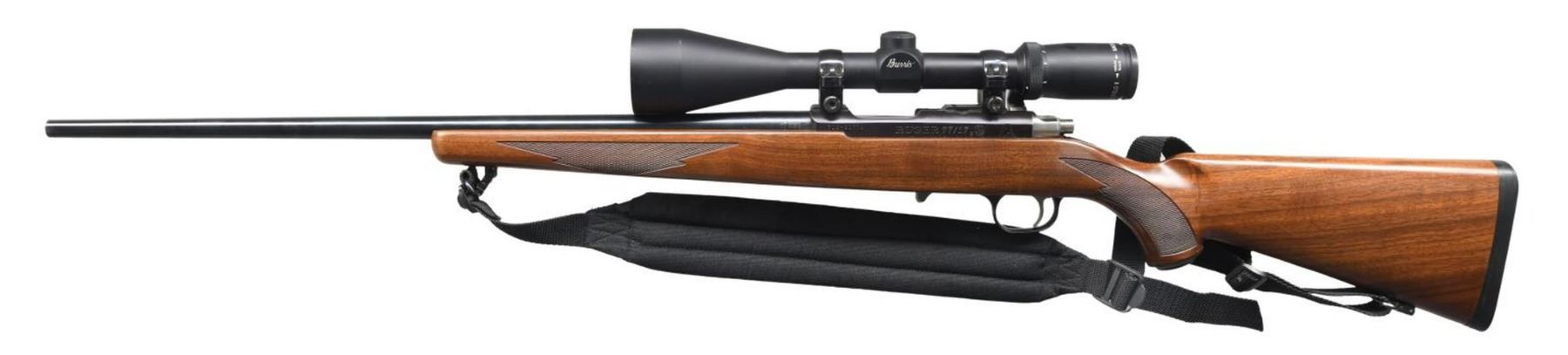 Cal. 17 HMR. S# 702-60775. Bbl. 22" without provision for sights. Mfg. 2002 (2002-2016) with checkered walnut stock having grip cap, detachable sling swivels holding black nylon sling and black rubber buttplate. Factory rings holding Burris 3.5X-10X matte finished Fullfield II scope with duplex reticle having 3 holdover dots below center cross plus Euro fast focus eyepiece. Fitted with stainless aftermarket extended magazine release. MAGS: 1 factory 9 rd. UNATTACHED ACCESSORIES: original box and packaging. CONDITION: faint stock handling marks plus light rub marks on scope body, but clearly near excellent in all other respects including bore and scope set to include optics. (23-5998/NW). MODERN. $500-750.