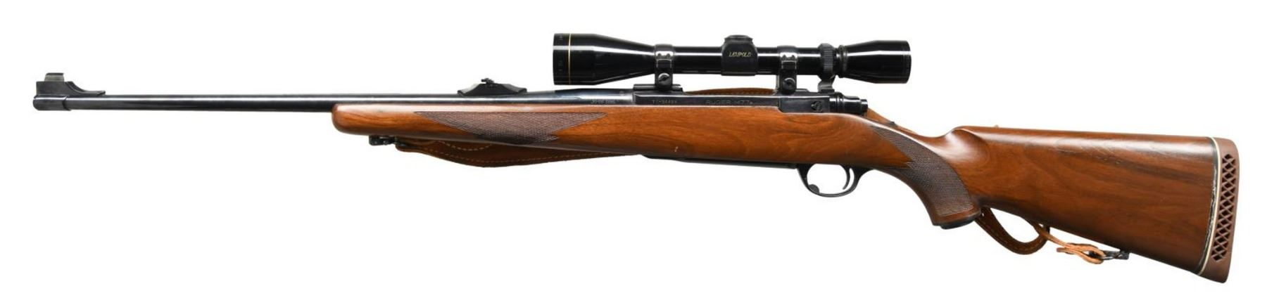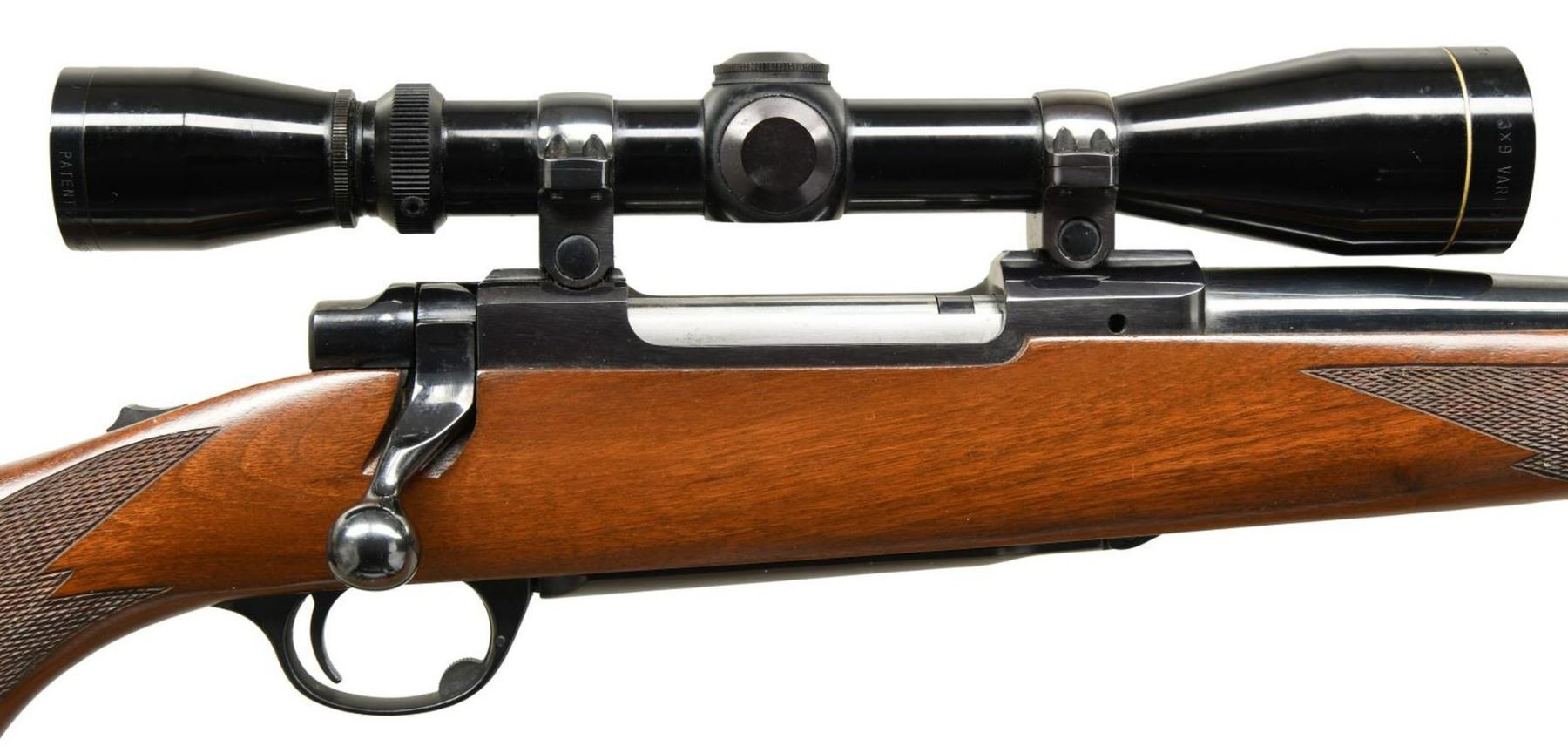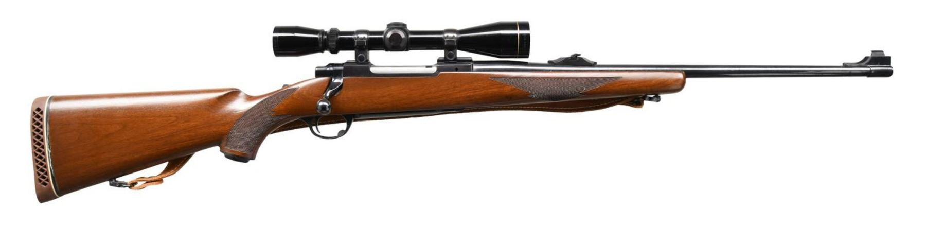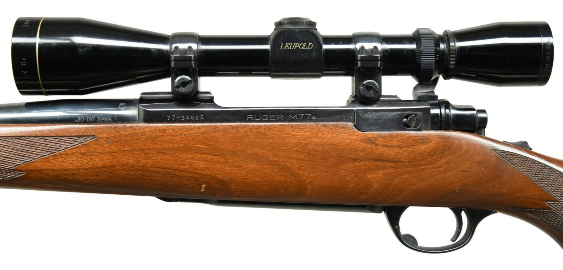 Cal. 30-06. S# 77-34625. Bbl 22". Model 77, manufactured by Ruger in 1982. Top of barrel is marked w/ Ruger's 2-line address w/ the caliber designation stamped on the left side at the breech. Left side of receiver bears the serial number followed by "RUGER M77". Blued finish w/ 1-piece checkered wood buttstock. Receiver is mounted w/ a Leupold 3x9 VARI-X IIc scope. Bucheimer brown leather sling. CONDITION: very good w/ metal components retaining the vast majority of their original factory blue finish, exhibiting some spots of minor surface oxidation. Mirror bore exhibiting some light spots of oxidation & well-defined rifling throughout. Stock shows some scattered marks from handling & storage, but is otherwise very good overall. Scope retains a clear & sharp optic. (23-2508/MLW). MODERN. $500-700.