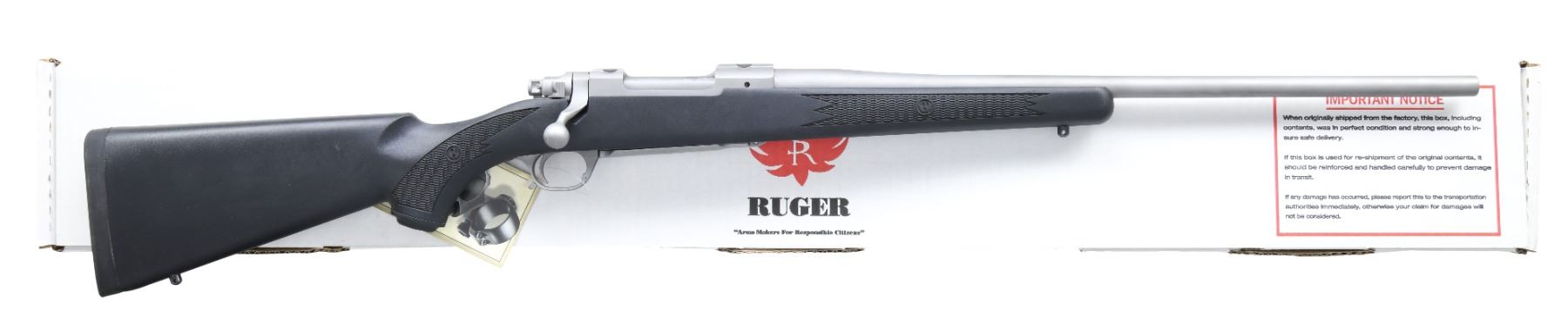 RIFLE. Cal. 358 Win. S# 710-02861. Bbl. 22" sightless. 3 position safety. Bases for Ruger rings. Matte stainless construction. Black synthetic stock. UNATTACHED ACCESSORIES: original box containing instruction manual, warranty card, Ruger rings & safety lock. CONDITION: as new w/ box. (24-3724/DS). MODERN. $400-600.