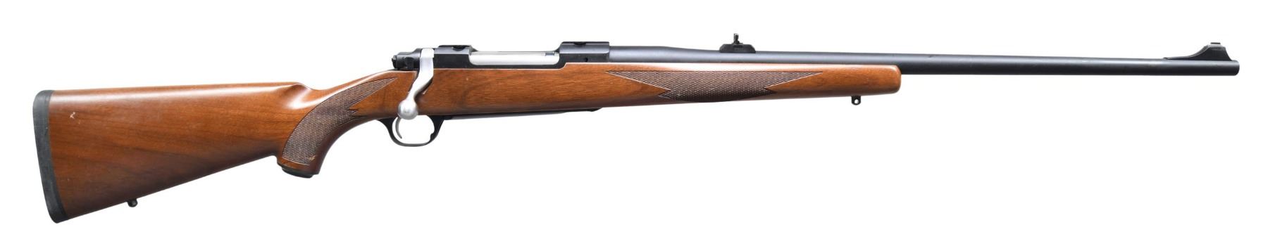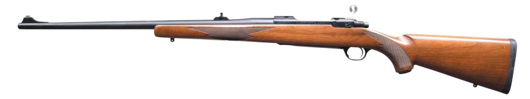 Cal. 300 Win. Mag. S# 782-69083. Bbl. 24" with addition of Lyman sight set; ramp and bead at front plus raised base and folding leaf at rear. Mfg. 1994 (1989-2006) originally set for Ruger rings only; sights added plus barrel and action has matte black Cerakote finish. Bolt and trigger guard assemblies have original finishes as does stainless trigger. Checkered walnut stock with factory finish, sling bases, black pad, grip cap and straight comb. CONDITION: very good appearance with numerous light handling marks on stock. Barrel has traces of prior oxidation necessitating its Cerakote refinish. Near excellent bolt and bore. Very good trigger guard assembly with light marks on bottom of guard bow. (25-3344/NW). MODERN. $350-500.