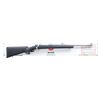 RIFLE. Cal. 375 Ruger. S# 710-15860. Bbl. 20". Ramp mounted white bead front sight w/ island mounted V notch rear sight. Action features 3 position safety & mounts for Ruger rings. Matte stainless finish. Hogue overmolded synthetic stock w/ solid black pad. UNATTACHED ACCESSORIES: original box containing instruction manual, warranty card, offer papers, sling swivels, Ruger rings & safety lock. CONDITION: as new w/ box. (24-3257/DS). MODERN. $600-900.