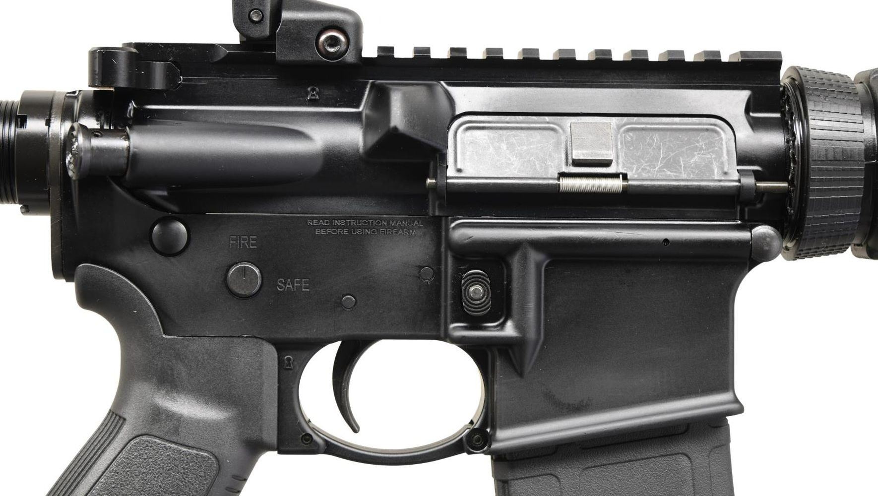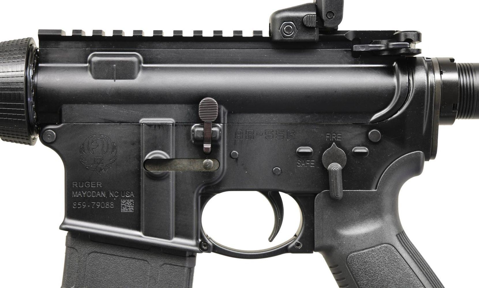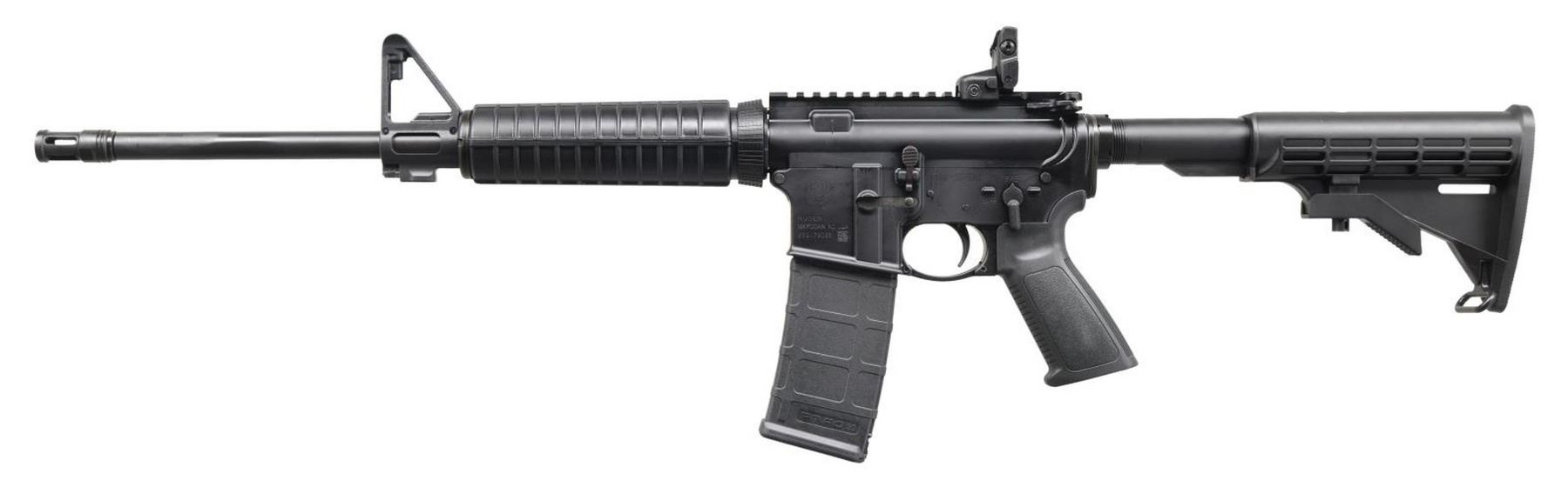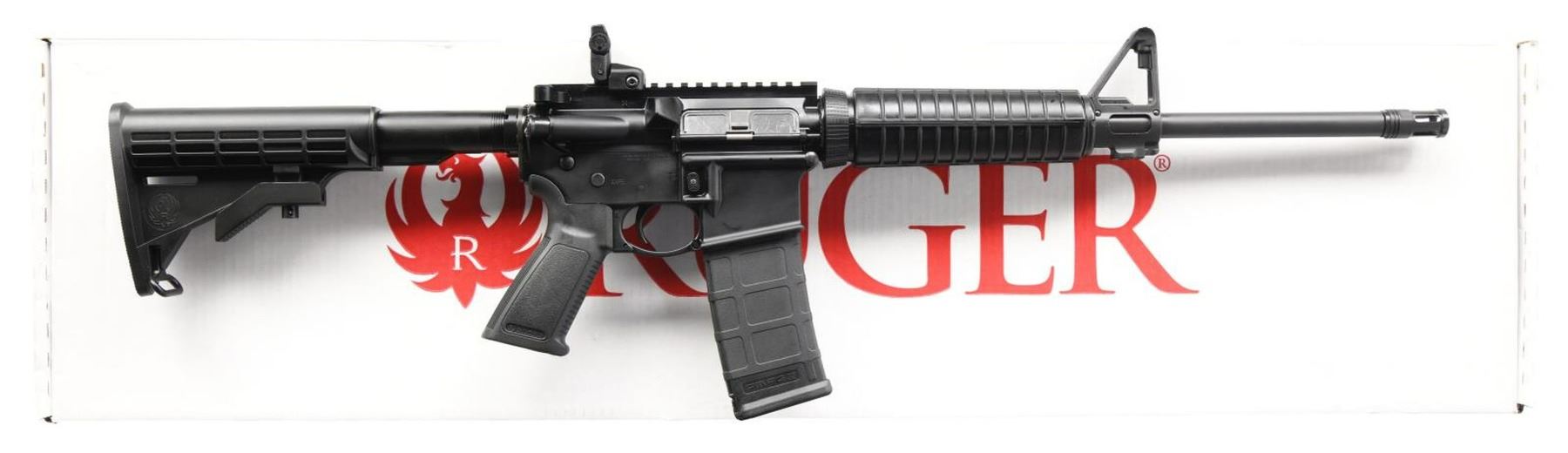 Cal. 5.56 Nato (223 Rem. also). S# 859-79088. Bbl. 16.1" cold hammer forged (for enhanced accuracy) threaded 1/2"-28 with factory flash hider. Mfg. 2021 as Model 08500 having A3 flat top upper with integral Picatinny rail plus Ruger Rapid Deploy rear sight; standard AR style front sight with serrated face to reduce glare. Unique Ruger screw attached Delta ring easily accepts carbine length handguards by user without having to compress a Delta ring spring. Ergonomic factory pistol grip and 6 position buttstock. MAGS: 1 factory supplied Magpul 30 rd. PMAG. UNATTACHED ACCESSORIES: factory box and packaging. CONDITION: all aspects near excellent appearing new and unfired. PROVENANCE: The Collection of Gun Sport Ltd. owned by Jon R. Thomas. (23-3362/NW). MODERN. $500-700.