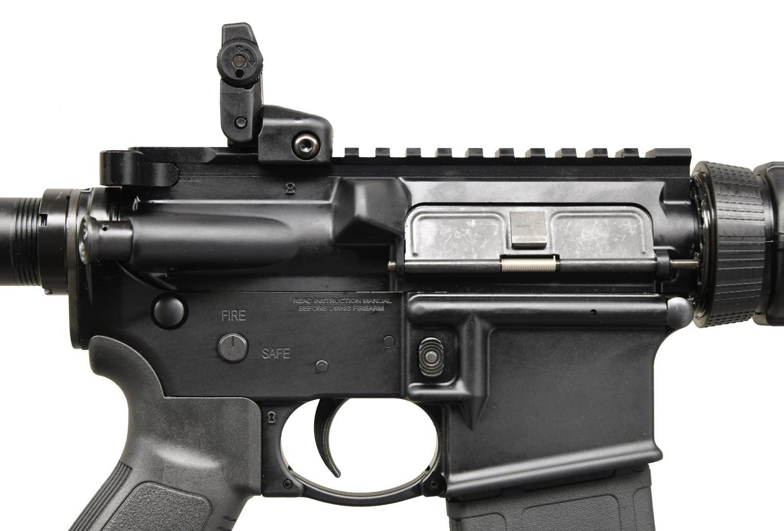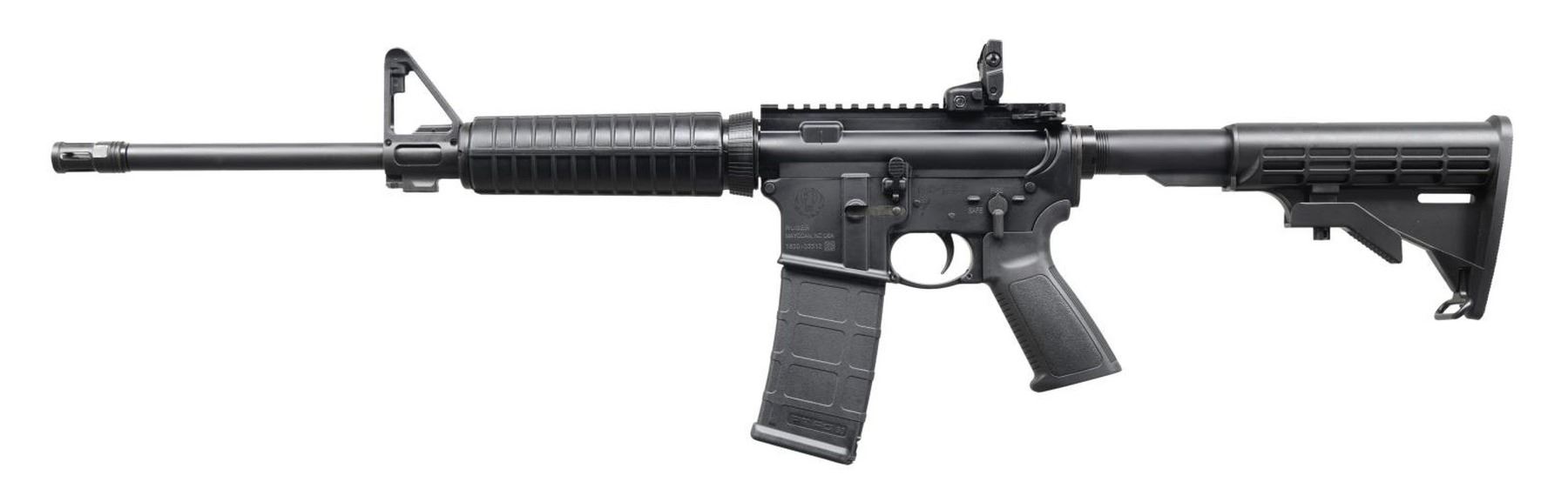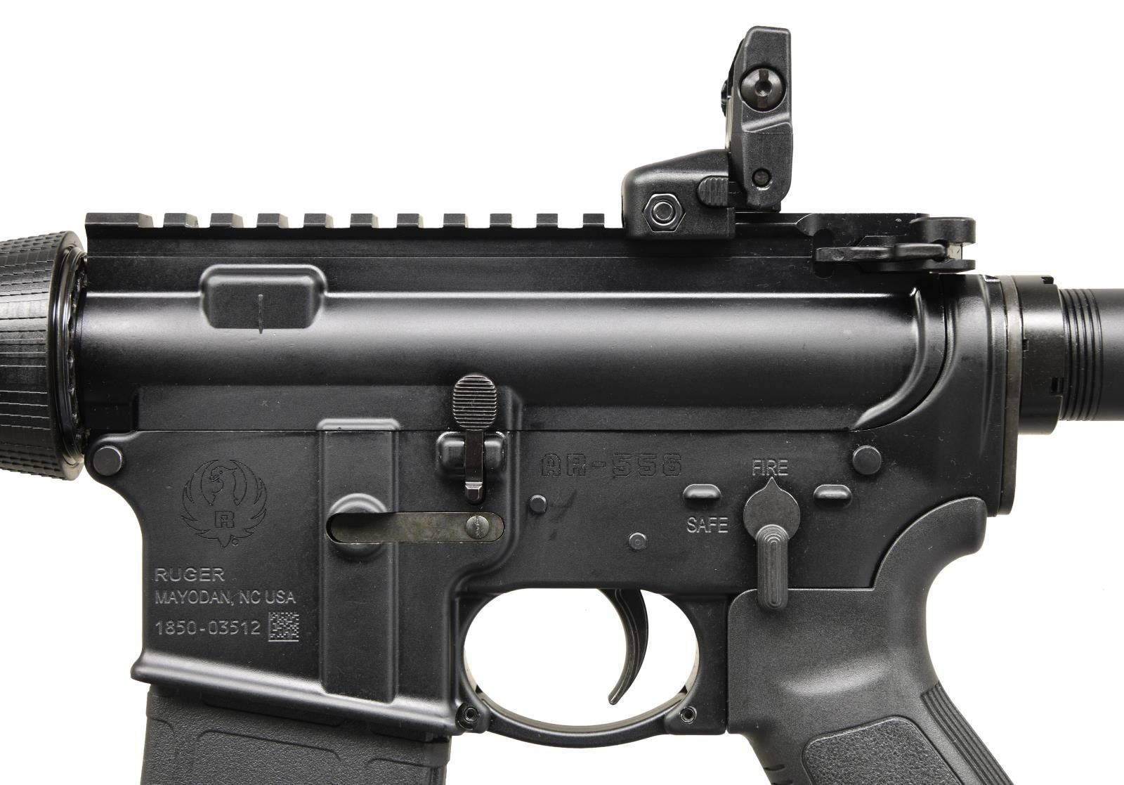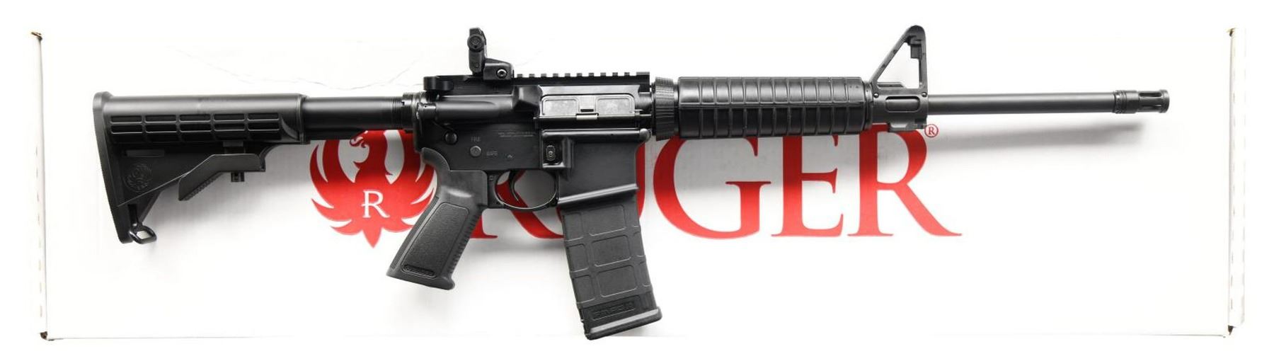 Cal. 5.56 Nato (also 223 Rem.). S# 1850-03512. Bbl. 16.1" medium weight hammer forged having 1 in 8 twist for optimum stabilization of bullet weights from 35-77 grains; 1/2-28 threaded with Ruger flash suppressor. Mfg. 2021 at Ruger's new Mayoden, NC facility. Modern Sporting Rifle with all the latest desired features such as: single stage trigger, enlarged trigger guard, ergonomic grip, M4 positioned gas block with provision for centrally located push button detachable swivel & integral bayonet lug, serrations on rear of front sight to reduce shooter glare, screw Delta ring for ease of Carbine length handguard removal, A3 style receiver having Picatinny rail along with Ruger pop up A2 style rear sight and military spec 6 position collapseable buttstock. All these features on an entry level rifle at $1,019 MSRP shows why Ruger is such a successful and innovative company. MAGS: 1 factory supplied 30 rd. Pmag. UNATTACHED ACCESSORIES: factory box and packaging. CONDITION: all aspects near excellent appearing new and unfired. PROVENANCE: The Collection of Gun Sport Ltd owned by Jon R. Thomas. (23-3370/NW). MODERN. $650-900.