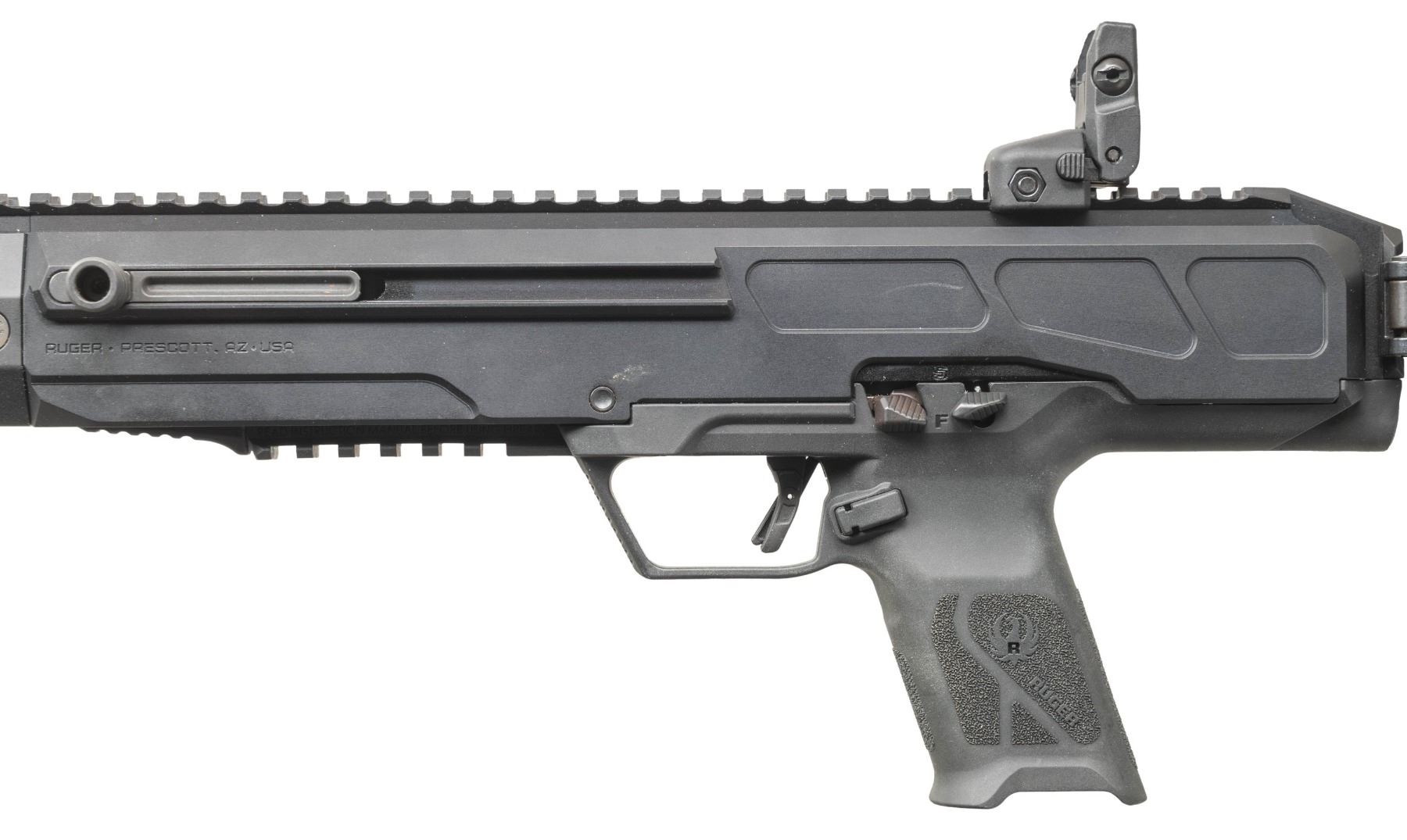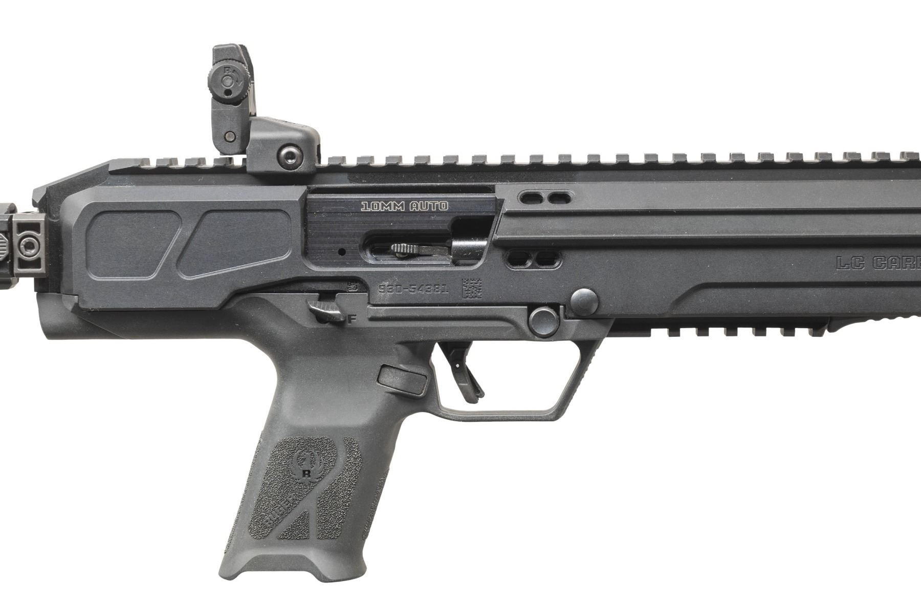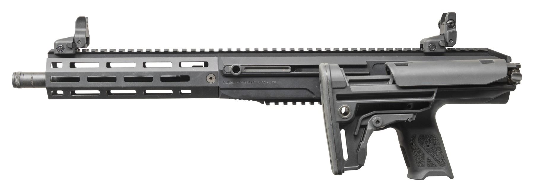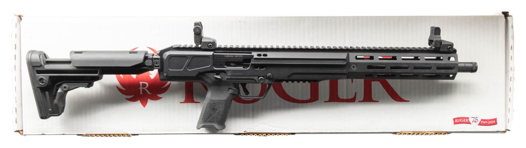 Cal. 10MM Auto. S# 930-54381. Bbl. 16.25" cold hammer forged having 1 in 16" twist rate; threaded .578X28" with thread protector. Mfg. 2024 (2022 to date) as Model 19370 in Prescott, AZ with CNC machined ventilated aluminum handguard having full length Picatinny top as continued from its flat topped receiver plus M-LOK slots. Immense left handed consideration in its design having reversible 5 LOP position folding buttstock, magazine release and charging handle; also has ambidextrous 1911 style safety combined with trigger blade safety for its Secure Action fire control system. Fitted with multiple QD sockets and Ruger Rapid Deploy folding sights. Ergonomically designed for use and balance with bolt over barrel plus accepts common full sized Glock magazines. MAGS: NONE. UNATTACHED ACCESSORIES: matching numbered box and packaging. CONDITION: all aspects near excellent including bore; appears new and unfired. PROVENANCE: Estate of Groves Herrick. 25-5649/NW). MODERN. $500-750.
