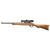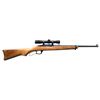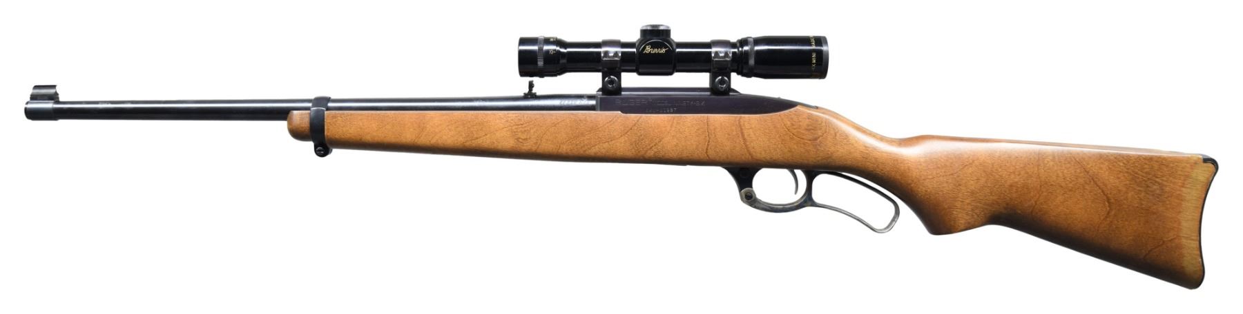 Cal. 44 Mag. S# 640-01987. Bbl. 18 1/2" with banded brass bead front sight and folding leaf rear. Mfg. 1997 (1996-2008) as Model 96/44; also offered in rimfire calibers. Walnut stained birch stock with black Celcon carbine buttplate. Steel receiver factory machined for Ruger scope rings holding high quality Burris gloss finished 4X Mini duplex reticle scope having adjustable objective. Ruger's only venture into lever action models. MAGS: 1 factory 4 rd. CONDITION: all aspects near excellent including bore and scope set. (25-3710/NW). MODERN. $650-900.