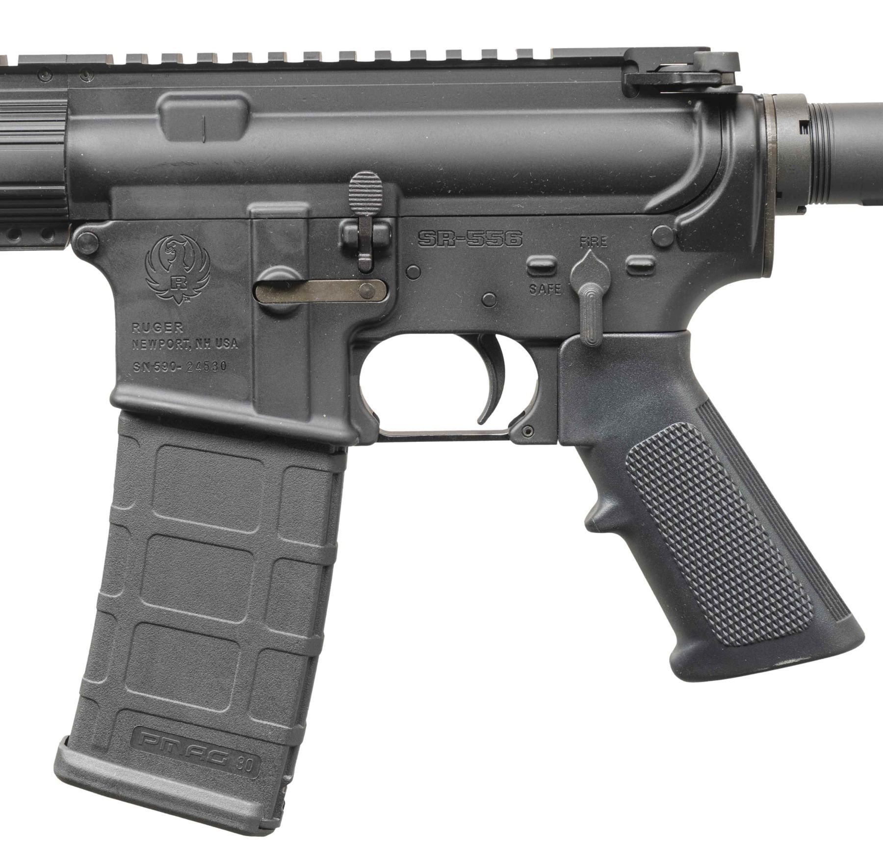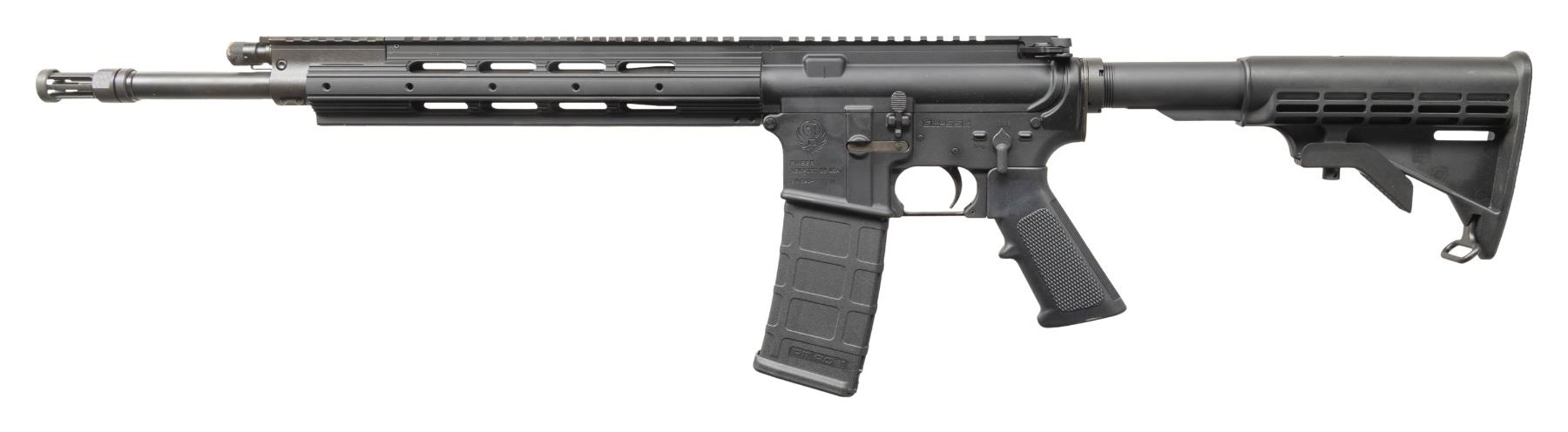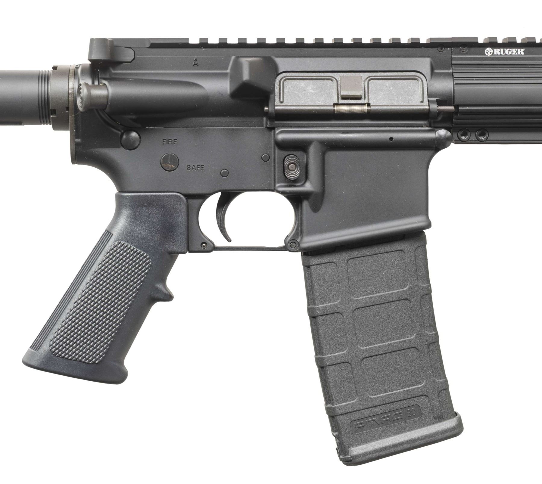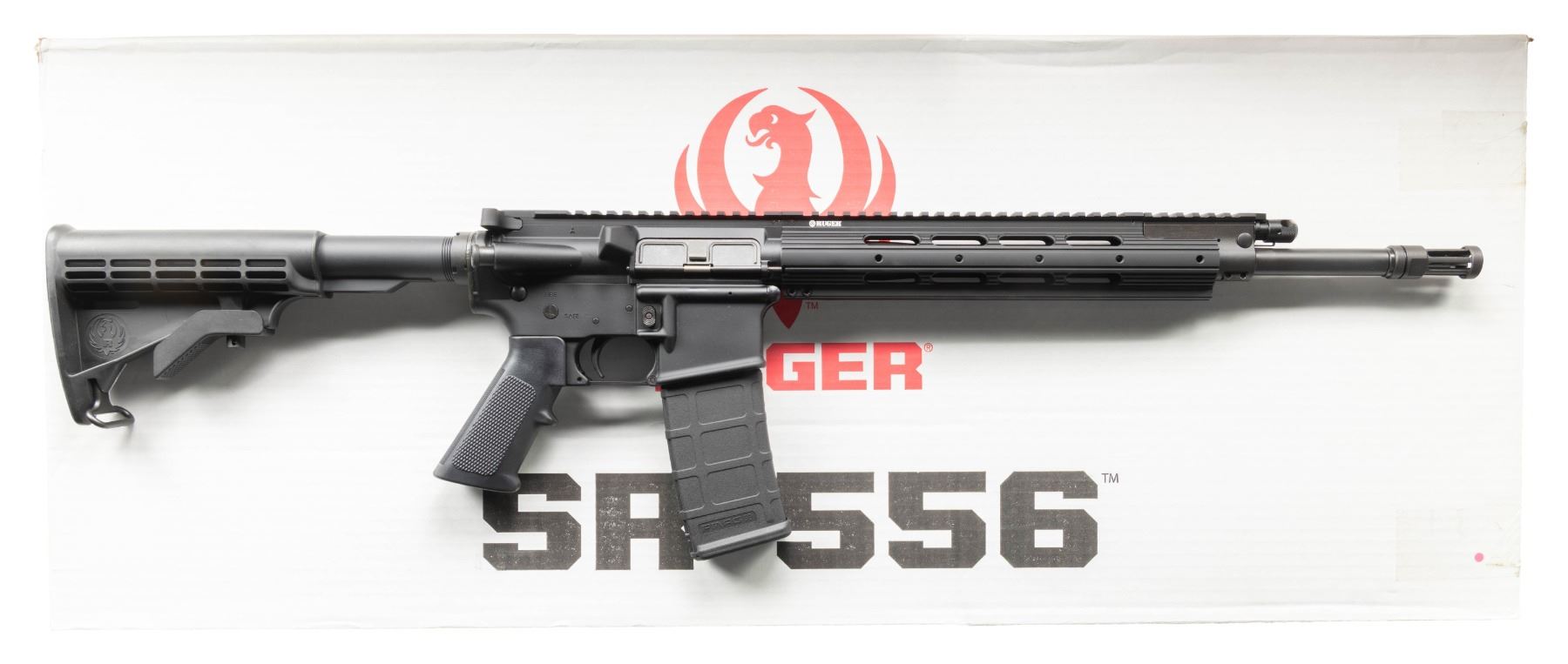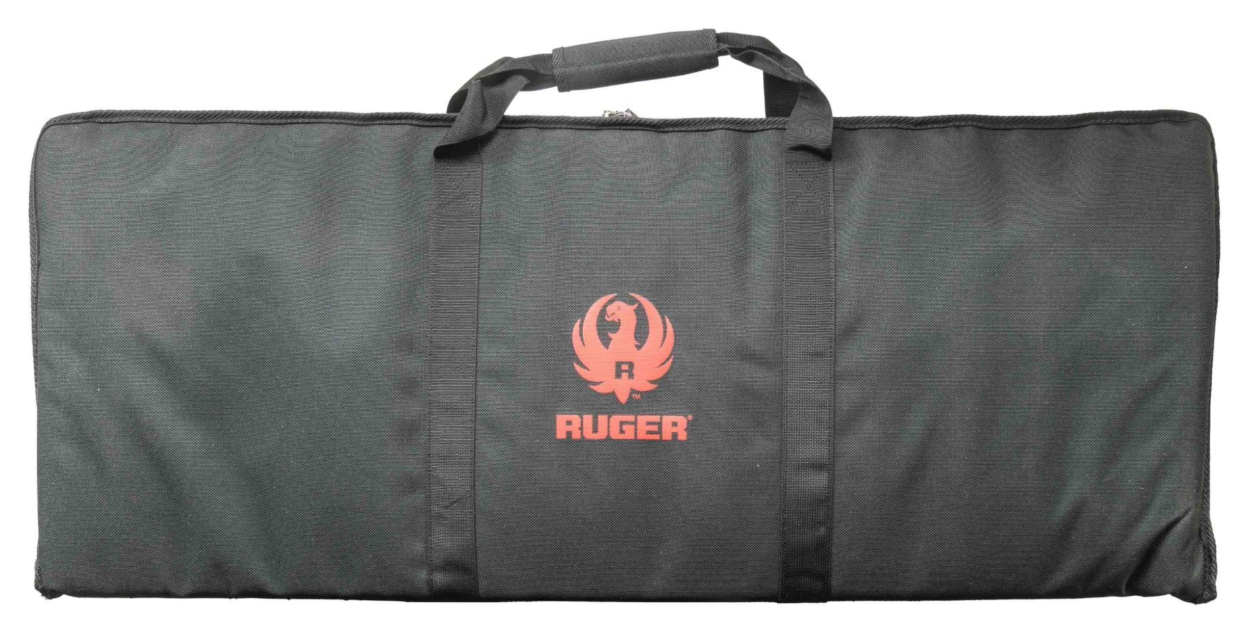 Cal. 5.56 Nato. S# 590-24530. Bbl. 16.1" cold hammer forged having 1 in 9" twist rate; Ruger flash hider and gas block having 2 stage regulator plus Picatinny top. Designed by Ruger as gas piston driven action rather than more common gas impingement system. Mfg. 2011 (2011-2014) as Model 05912 in Newport, NH with ventilated aluminum handguard having full length Picatinny top as continued from its flat topped receiver. Six position M4 style Ruger buttstock, standard trigger guard, single stage trigger, matte black oxide finish, M4 feed ramp cuts, and A2 style pistol grip. MAGS: 1 PMAG 30 rd. UNATTACHED ACCESSORIES: matching numbered box and packaging plus black nylon carry case with red Ruger logo on sides. CONDITION: all aspects near excellent including bore; appears new and unfired. (24-3604/NW). MODERN. $500-750.