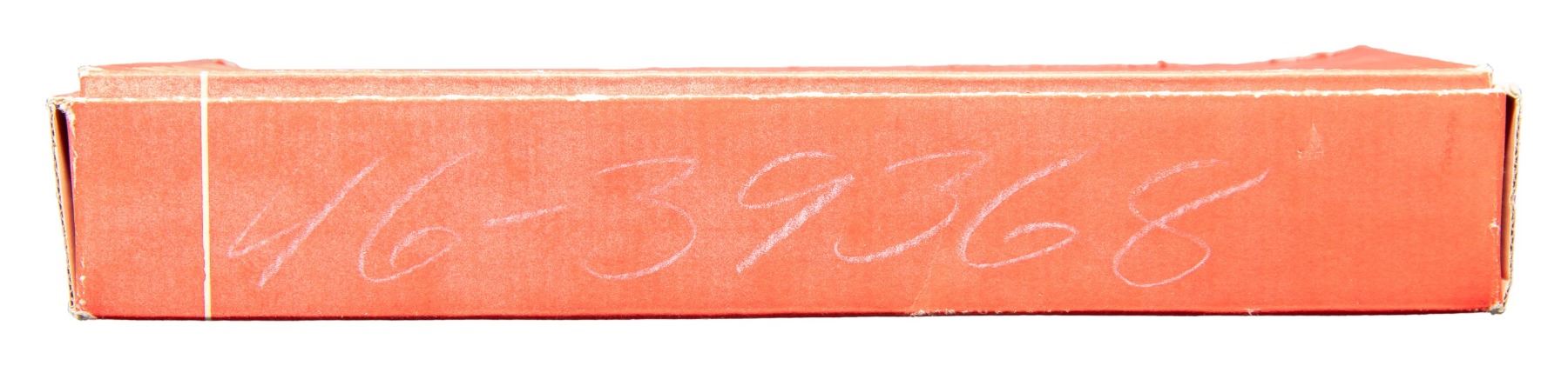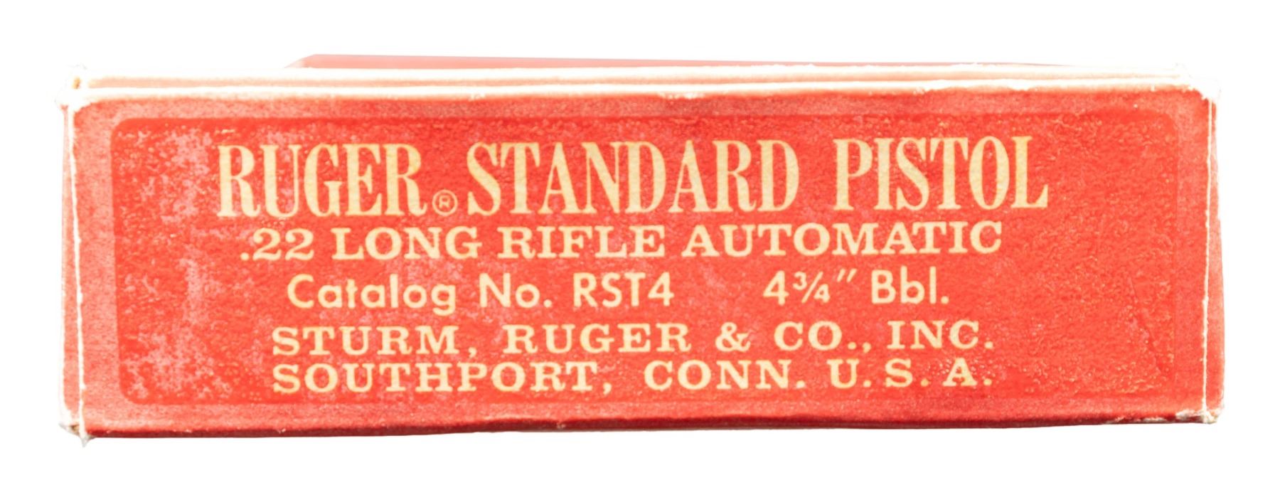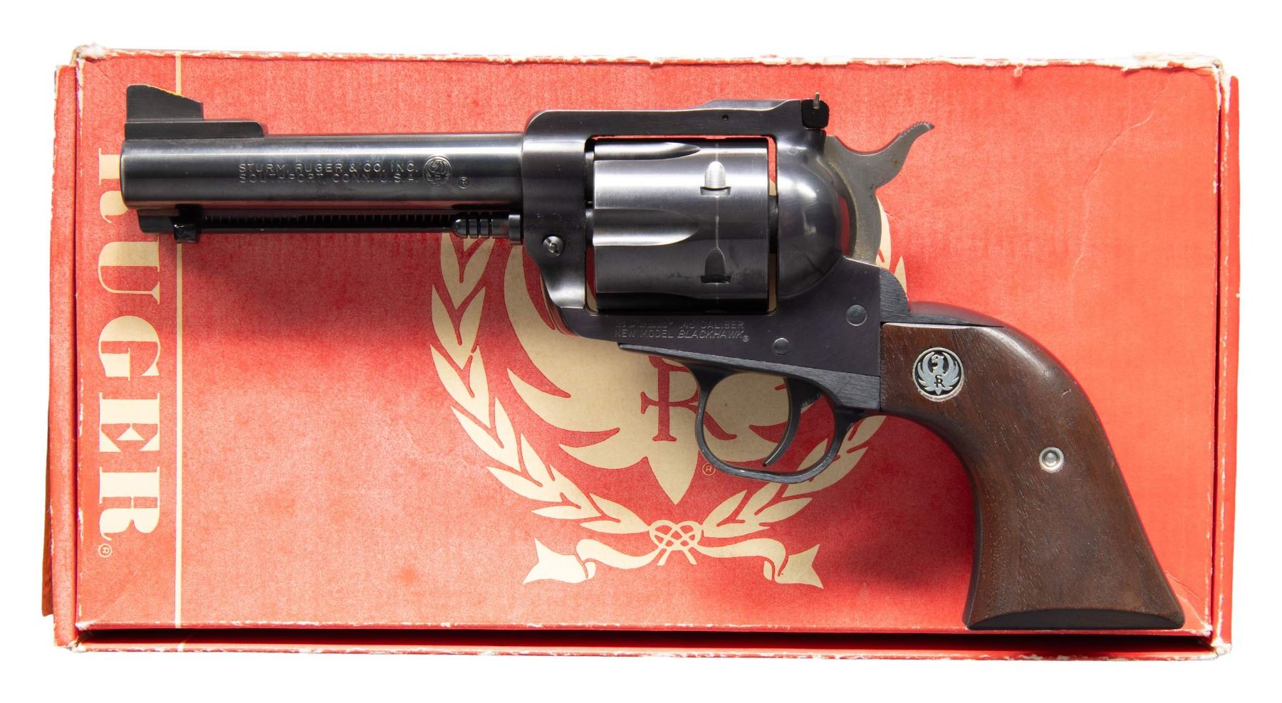 FACTORY RED BOX. Cal. 45 Colt (45 LC). S# 46-39368. Mfg. 1977 as Catalog No. BN-44; no "Liberty" or "Warning" markings. Bbl. 4 5/8". Serrated ramp front sight has orange paint applied; adj. square notch rear sight. Matching numbered 6 shot cyl. Blued & Black finish; black paint on ejector housing. XRN-3RED frame has smooth walnut grips with black eagle medallions. UNATTACHED ACCESSORIES: correct red & white box w/ matching grease pen number on side & Blackhawk BN44 label on end. Box contains Aug 11, 1978 invoice to Norm Greenberg along with wax paper, Ruger warranty card & gun show card. CONDITION: over 90% original blue & black finish with light handling wear, scattered light marks, cyl. turn line & spots of residue. Paint applied to front sight & majority of ejector housing along with overspray on barrel. Very good grips with scattered dents. Very good bore with strong rifling. Box intact good condition with scuffs, sm. tears & sm. holes. PROVENANCE: The Esteemed Norm Greenberg Collection. (25-4155/MD). MODERN. $400-600.