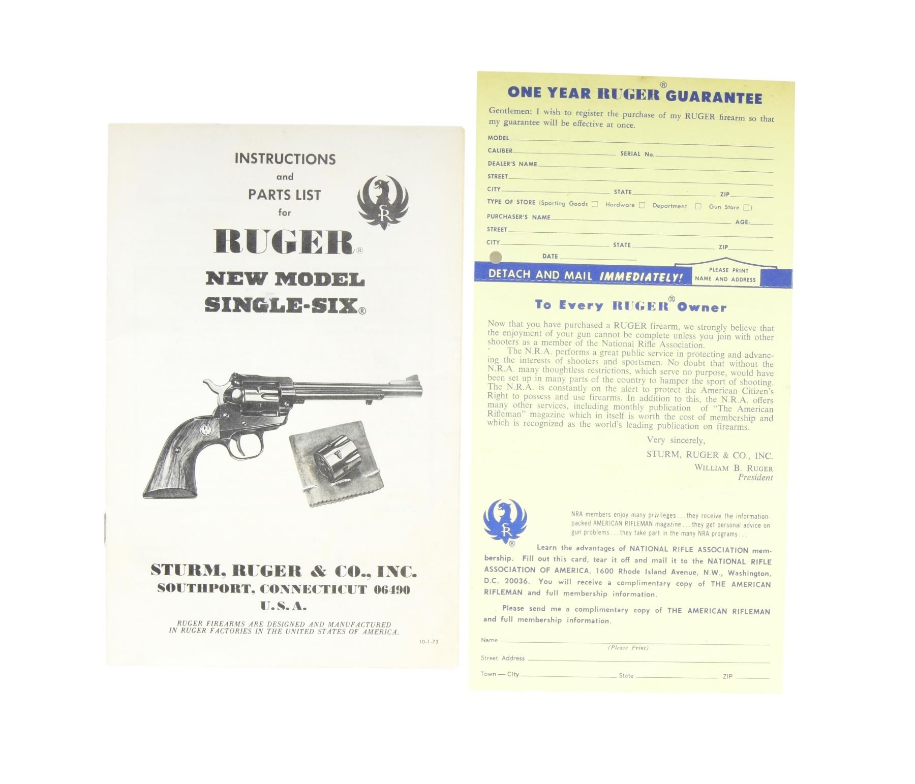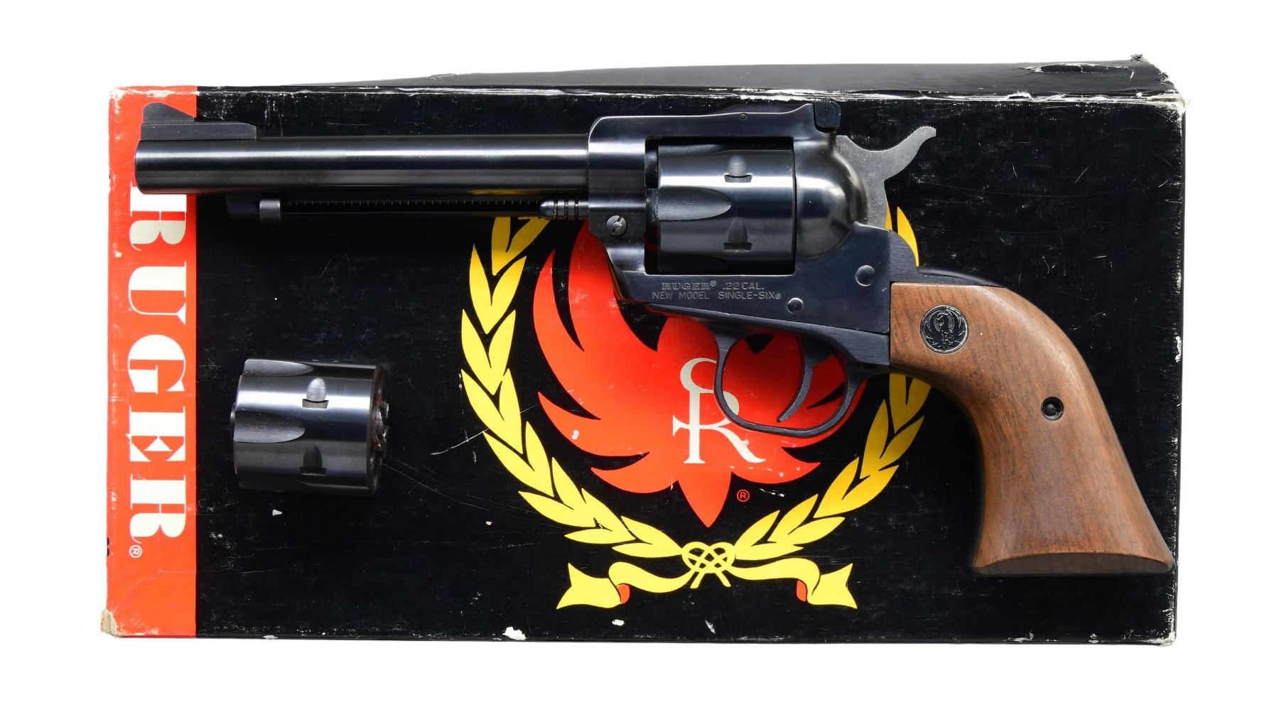 WITH EXTRA CYLINDER Cal. 22 LR S# 62-00073. Consecutively numbered to lot 2613. This Ruger New Model Single-Six revolver features a blued finish. It has a 5.5-inch barrel, a ramp front sight, and an adjustable rear sight. The revolver is equipped with a single-action trigger and a spur hammer. The six-round cylinder is fluted. The revolver comes with an additional fluted cylinder. The grips are smooth wood with Ruger medallions. CONDITION: Overall condition is excellent with 95% original finish remaining on the barrel and frame. The grips are in excellent condition with minimal wear. The bore is bright with strong rifling. MODERN (23-6559) $300-500.