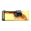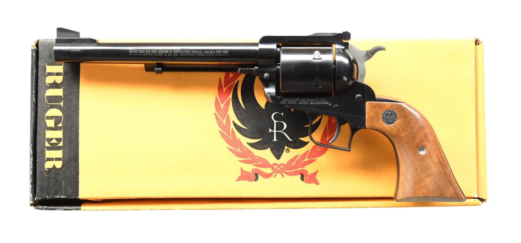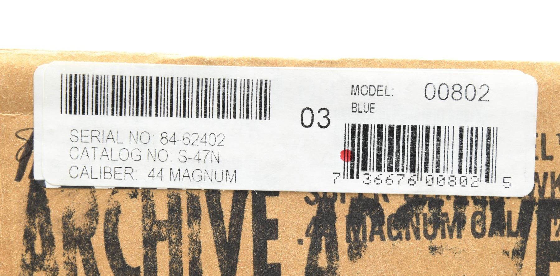 Cal. 44 Mag. S# 84-62402. Bbl. 7 1/2" with "warning marks" (initiated 1978) and ramped serrated blade front sight; factory adjustable rear. Mfg. 1982 (1973 to date) as Model S47N having modern transfer bar ignition system, wide spur hammer, wide serrated trigger, no firing pin groove for its unfluted cylinder, all steel construction (except black anodized alloy ejector housing), Dragoon style grip frame and varnished walnut grips with silver eagle medallions. Common variation that was in Ruger's Archives and likely sold throuth on of their benefit auctions. UNATTACHED ACCESSORIES: original 1 piece yellow box with packaging; separated end label due to poor glue. Outer cardboard shipping sleeve with added bar coded sticker plus large black stamped "ARCHIVE". CONDITION: all aspects near excellent appearing new and unfired. (24-2898/NW). MODERN. $500-750.