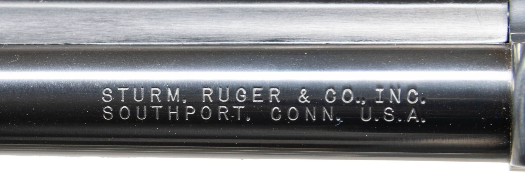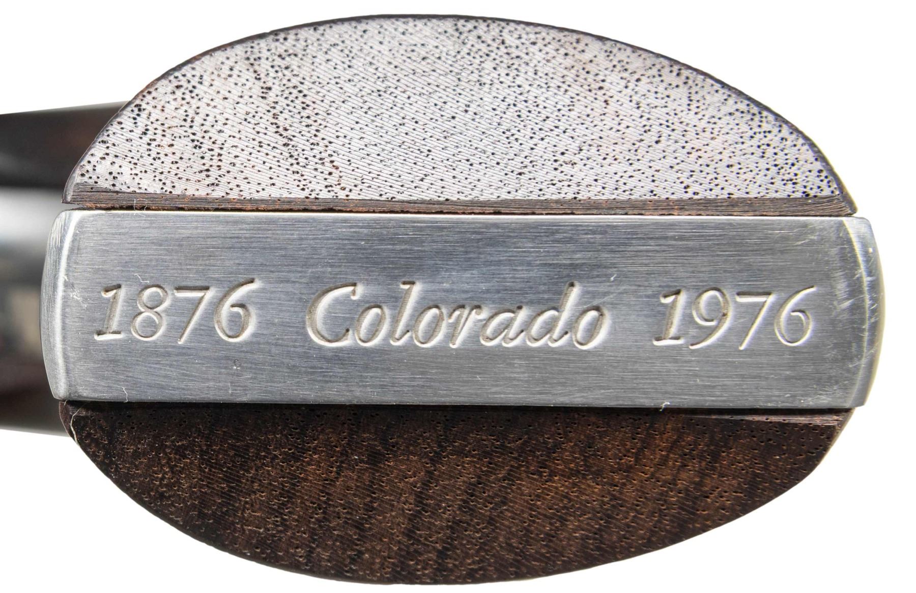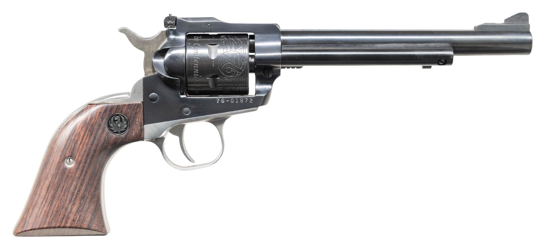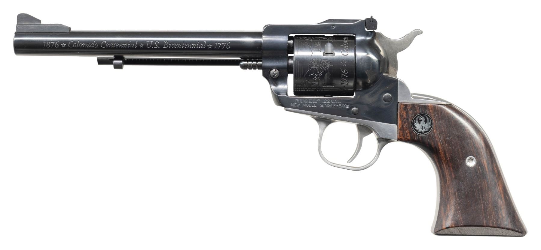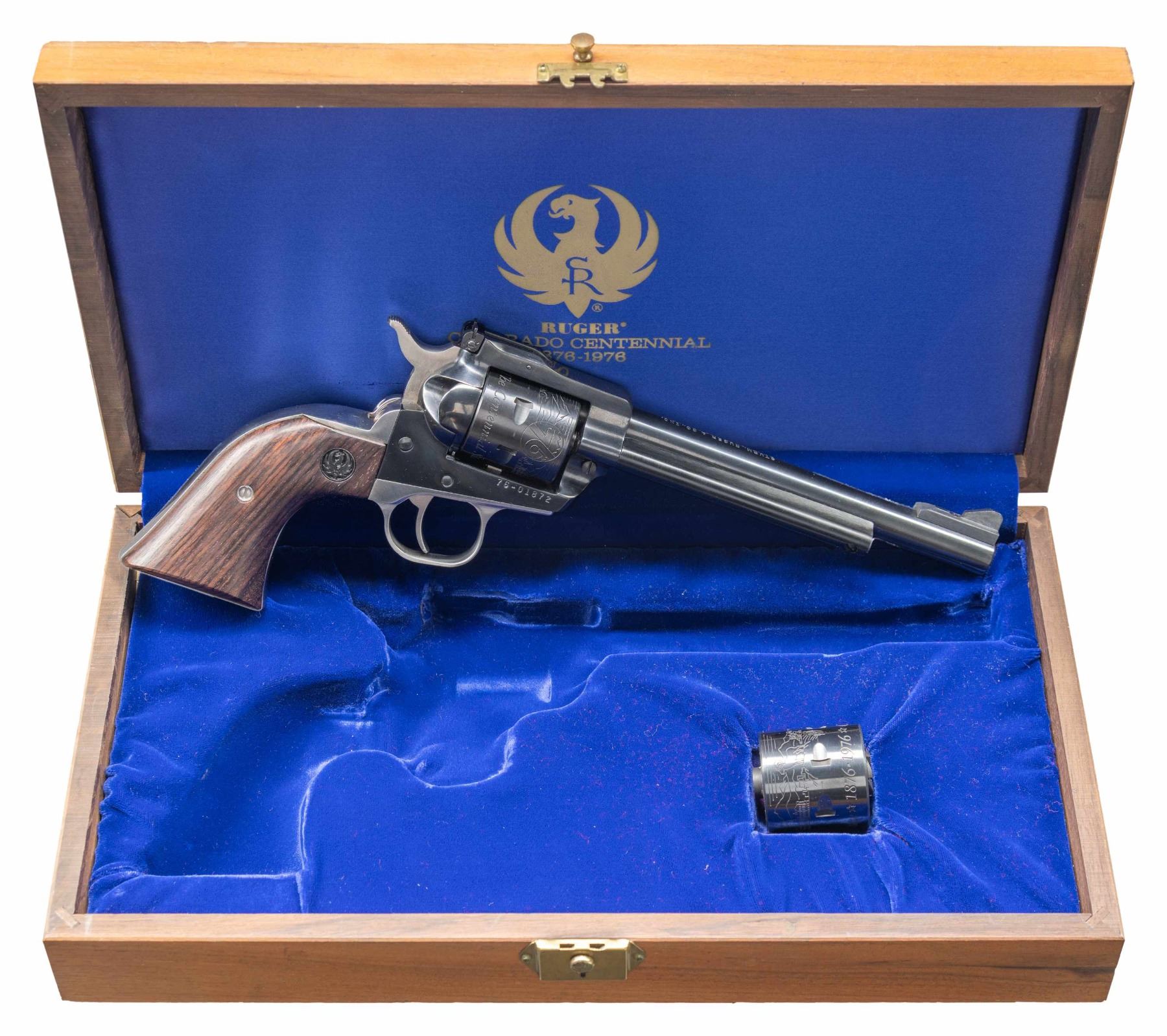 CONVERTIBLE REVOLVER Cal. .22 LR / .22 Mag. S# 76-01872. Bbl. 6 1/2" with screw attached ramped serrated blade on base front sight and frame mounted factory adjustable rear sight. Mfg. 1976 as Catalog No. RCC6 to celebrate the 100th year of Colorado statehood; 15,888 units. Features include a blued finish accented with a stainless steel grip frame having "1876 Colorado 1976" on butt. Cylinders are unfluted of 6 rounds with commemorative roll markings. Smooth rosewood grips with Ruger silver eagle medallions. Although made in 1976, this commemorative does not have the typical Bicentennial markings found on all other Ruger firearms made in 1976. UNATTACHED ACCESSORIES: near excellent walnut presentation case having colorful porcelain Centennial plaque on lid. Royal blue interior with gold labeling on satin under lid plus velvet shadow lined bottom for revolver and its 22 Mag. cylinder. CONDITION: Overall condition is near excellent with new unfired appearance to include bore and grips. PROVENANCE: Estate Collection of John "Jack" Dhooghe. (25-5544/NW) MODERN $500-$700.