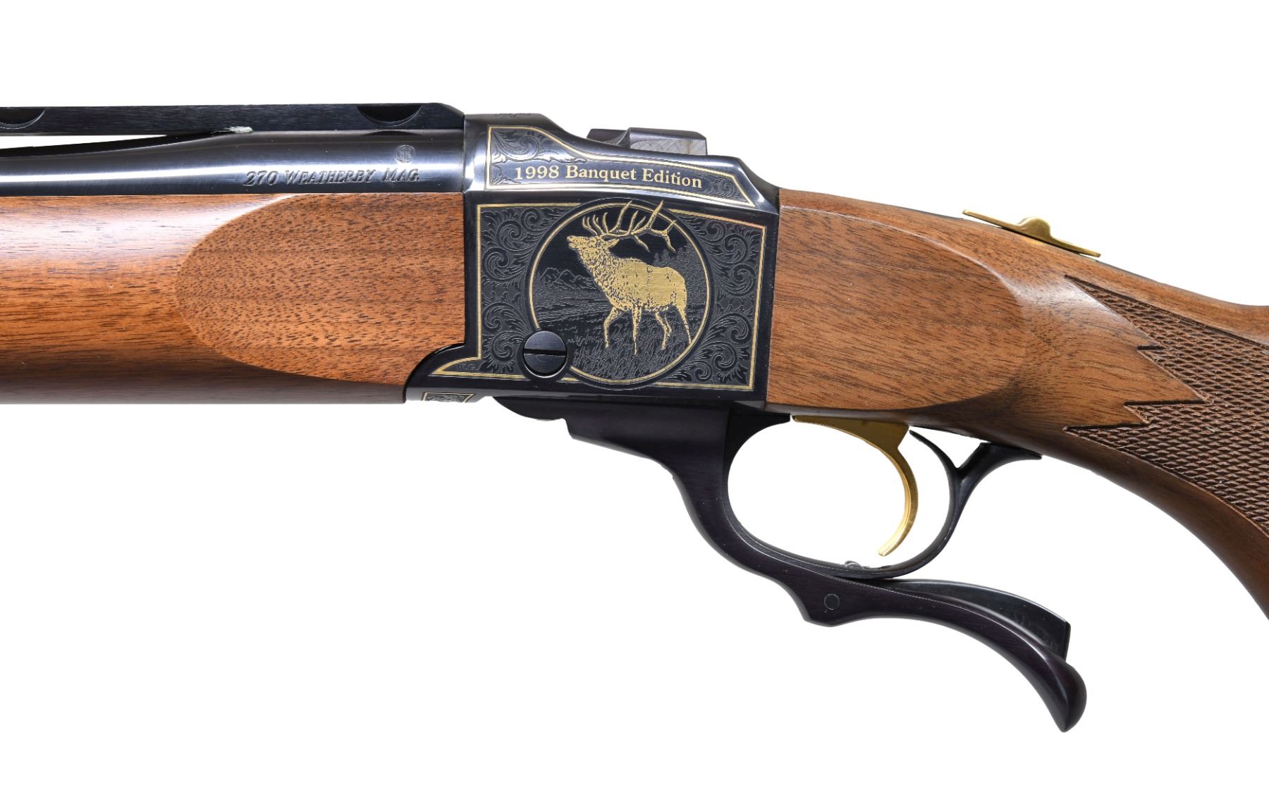 SHOT RIFLE. Cal. 270 WBY Mag. S# 133-45950. Bbl. 26" w/ quarter rib. Receiver has special gold plated 1998 banquet edition RMEF markings. Both sides of receiver feature elk surrounded by scroll engraving. Bottom of receiver is marked "157/400". Gold finished safety & trigger. Semi-beavertail forearm & pistol grip walnut stock w/ cut checkering, steel grip cap, swivel bases & solid black pad. UNATTACHED ACCESSORIES: green canvas covered leather trimmed luggage case w/ green felt fitted interior. Inside of lid has leather label marked "Rocky Mountain Elk Foundation 1998 Banquet Gun". Case contains instruction manual, warranty card, special offer card, Ruger rings, sling swivels & case keys. CONDITION: as new. (23-6497/DS). MODERN. $1,000-1,500.
