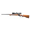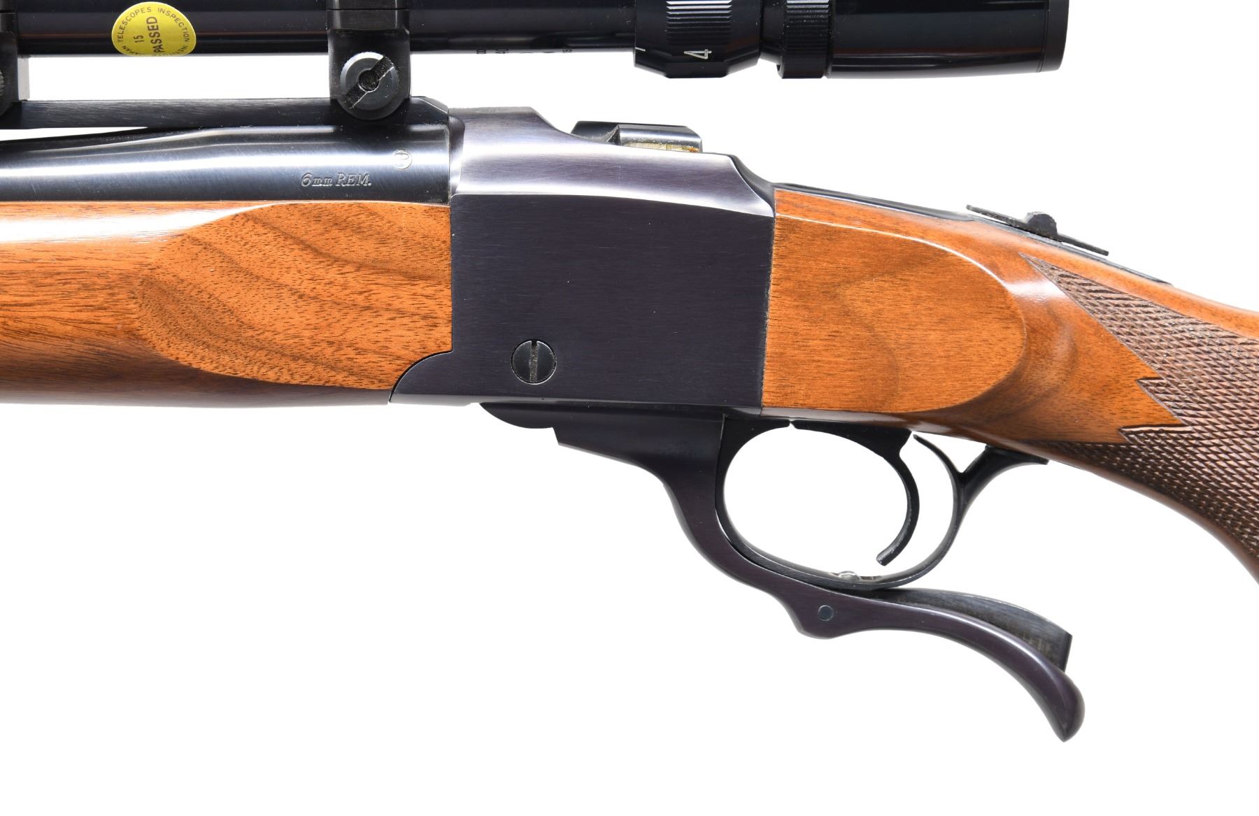 Cal. 6mm Rem. S# 130-31680. Bbl. 26" round w/ quarter rib. Bushnell Banner 4-12x40AO gloss finished scope w/ duplex reticle on Ruger rings. Semi-beavertail forearm & pistol grip stock of fancy walnut w/ cut checkering, steel grip cap, solid red pad & QD swivels. CONDITION: 97% blue showing muzzle wear. Very good wood finish w/ 1 gouge on bottom of forearm. Near excellent bore. Scope has clear optics. (24-5826/DS). MODERN. $1,000-1,400.
