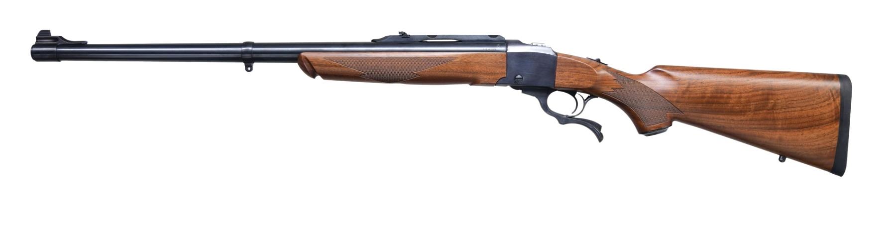 MATCHING FACTORY BOX. CAL. 416 RIGBY S# 134-08559 (2005). Blued finish with 24-inch barrel. Equipped with a bead front sight and an adjustable folding rear sight on quarter rib. Falling block action with blued lever. Checkered Alex Henry forearm and checkered pistol grip buttstock with a black hard rubber grip cap. Smooth black rubber pad. UNATTACHED ACCESSORIES: Factory box. CONDITION: Overall near excellent. Barrel retains approximately 95% original blued finish. Frame retains about 90% of the original blued finish. Forearm and buttstock show light handling marks with crisp checkering. Bore is bright with strong rifling. MODERN (24-3266/MD) $900-$1,400.