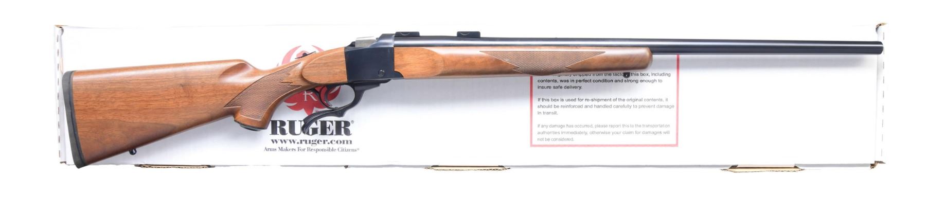 MATCHING FACTORY BOX. Cal. 6.5-284 Norma. S# 134-38169 (shipped 2013). The rifle features a blued finish with a 26-inch barrel with Ruger 2 piece bases. The falling block action is complemented by a checkered beavertail forearm and a pistol grip buttstock with a checkered grip, fitted with a factory black rubber pad. UNATTACHED ACCESSORIES: Factory box with packaging. CONDITION: Overall excellent condition with 99% of the original finish remaining on the barrel and frame. The forearm and buttstock are in excellent condition with no notable handling marks. The bore is bright with sharp rifling. MODERN. (24-3490/MD) $900-1400
