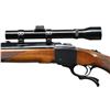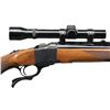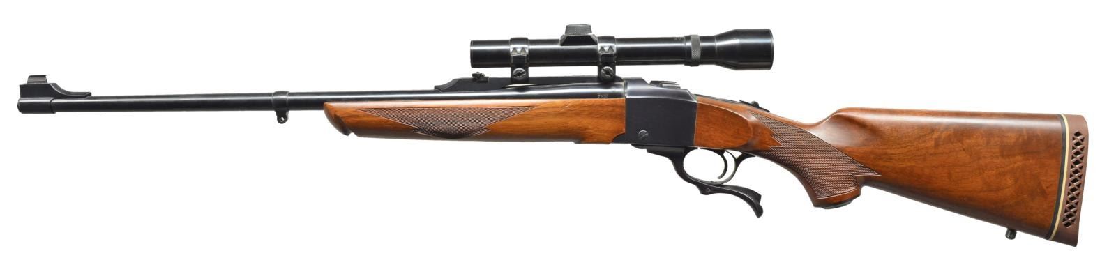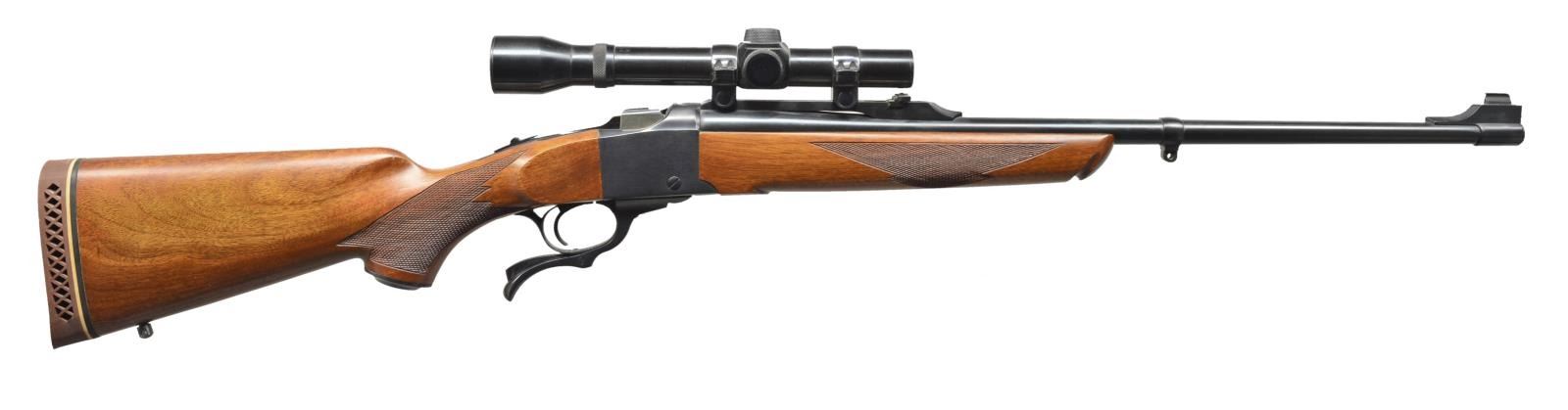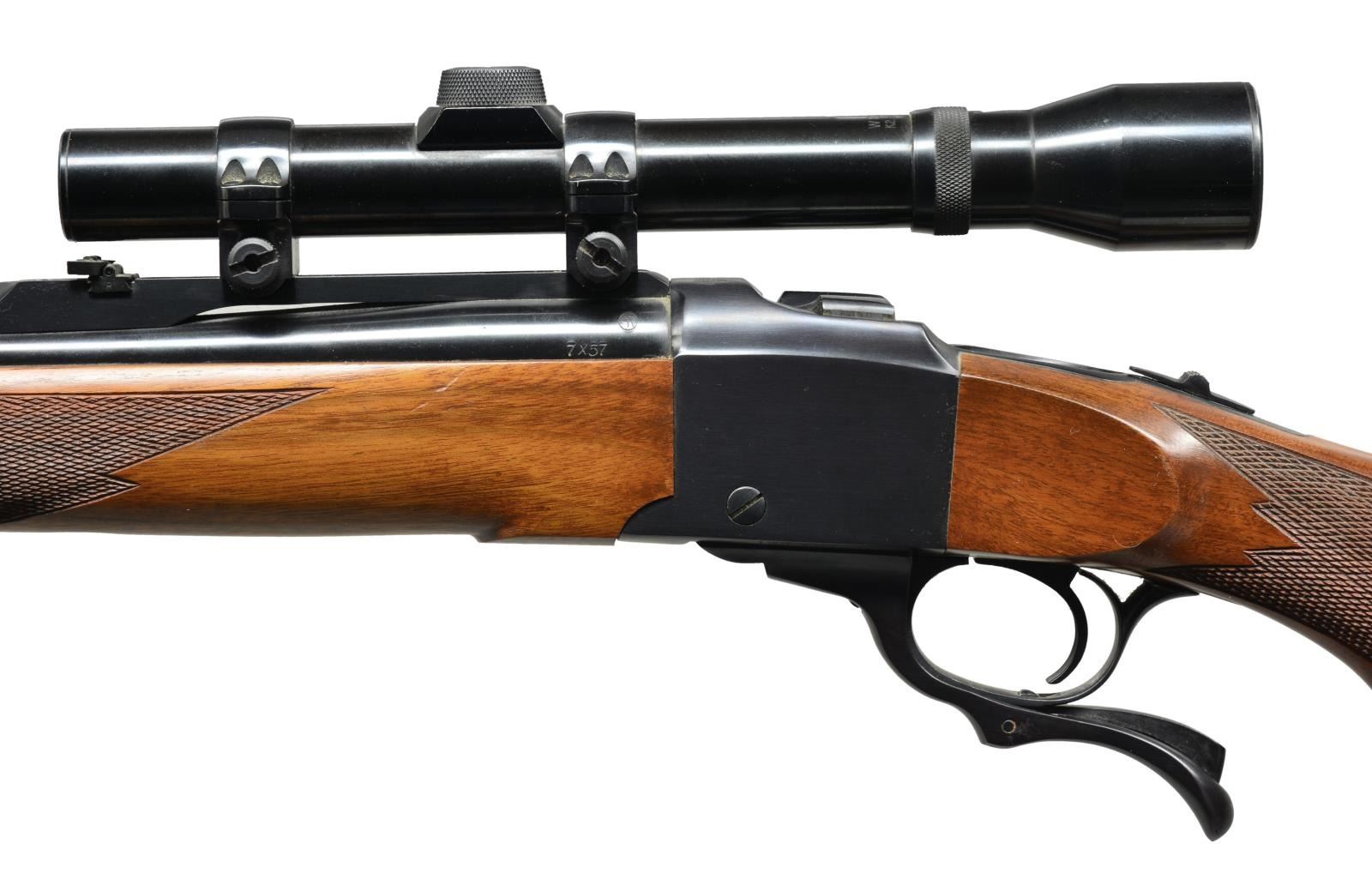 Cal. 7x57. S# 132-41188. Bbl. 22" light sporter weight. Band mounted bead front sight w/ quarter rib mounted folding leaf rear sight. Weaver K2.5-1 gloss finished scope w/ duplex reticle on Ruger rings & integral mts. Under lever operated falling block action. Blue finish. Alex Henry forearm & steel capped pistol grip stock of nicely grained walnut w/ cut point pattern checkering. Front swivel bases is bbl. band mounted. LOP: shortened to 12 1/2" over aftermarket White Line pad. Mfg. 1981. CONDITION: over 98% metal finish. Wood has good finish showing a scratch on left side of forearm. Scope has bright optics. Bright near excellent bore. (21-1175/DS). MODERN. $600-900.