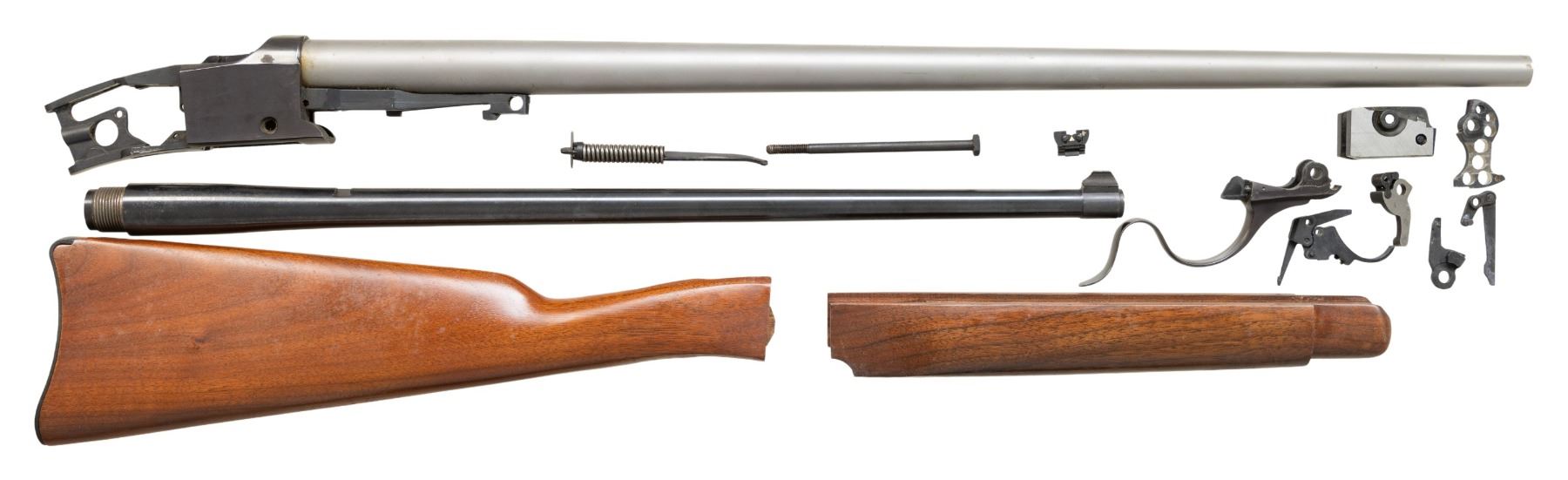Cal. 219 Wasp. S# 130-51282. Shilen 27" aftermarket barrel. Stripped action. Parts include Ruger Pre-Warning barrel,walnut stock set & group of small parts including lever, trigger, hammer, etc. CONDITION: very good barrel finish with pinprick patina. Very good blue. Very good wood finish. Sharp rifling. (26-1239/MD). MODERN. $200-400.