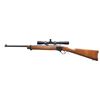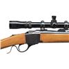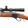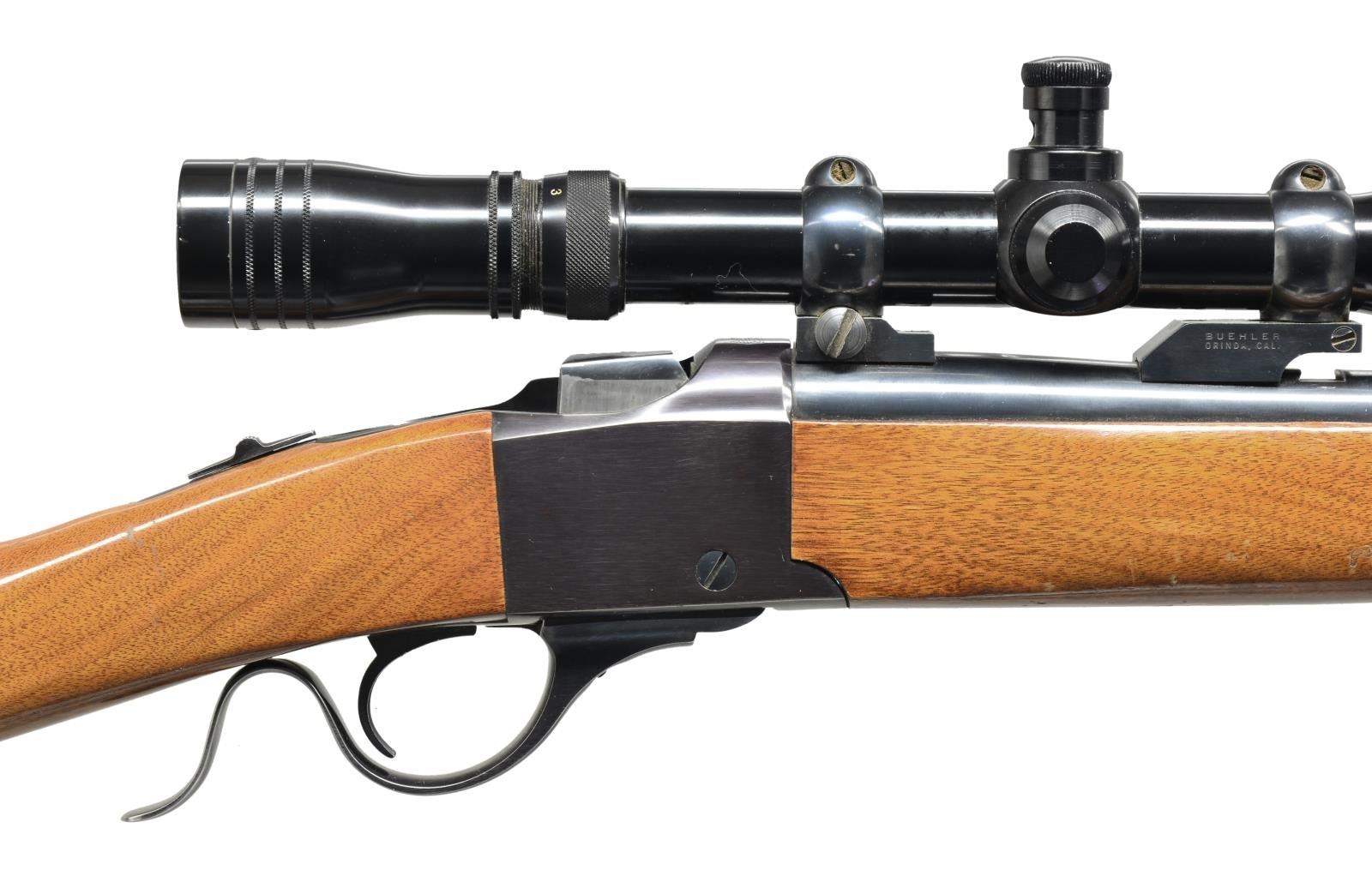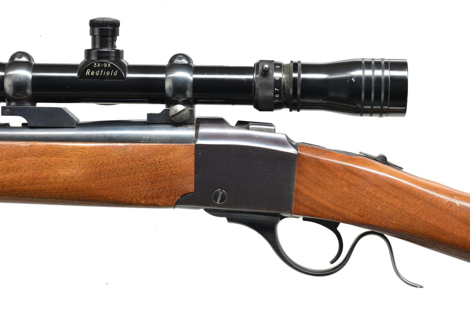 Cal. 22 Hornet. S# 130-52758. Bbl. 22" rnd. w/ band mounted bead front sight, open dovetail for rear sight. Redfield low profile 3x-9x gloss finished scope w/ range finding duplex reticle on Buehler mts. Blued falling block action w/ top tang safety. Band fastened carbine forearm & straight grip walnut stock w/ aluminum carbine buttplate & swivel eyes. CONDITION: 90% lightly faded blue showing edge wear. Wood shows numerous finish chips, scratches & marks. Bright bore retains strong rifling. Scope has clear optics. (21-124/DS). MODERN. $500-650.