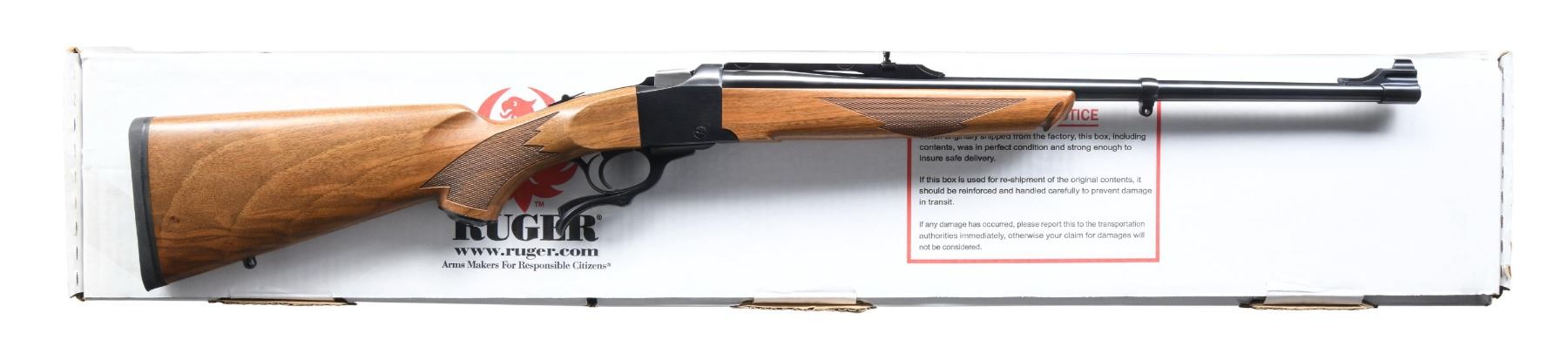 Cal. 308 Win. S# 134-36133. Bbl. 22" with banded user changeable brass bead front sight plus folding leaf rear on factory quarter rib machined for Ruger scope rings. Mfg. 2011 as Model 11359 having checkered walnut stock set (Alex Henry forend), grip cap, sling studs and black rubber pad. UNATTACHED ACCESSORIES: matching numbered factory box with packaging to include 1" factory scope rings. CONDITION: all aspects near excellent with new, unfired appearance. (24-3646/NW). MODERN. $800-1,200.