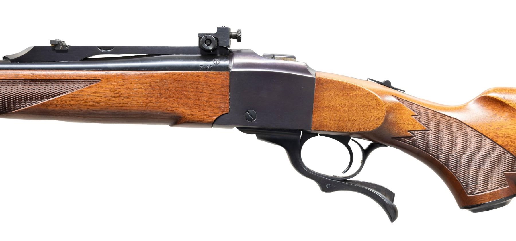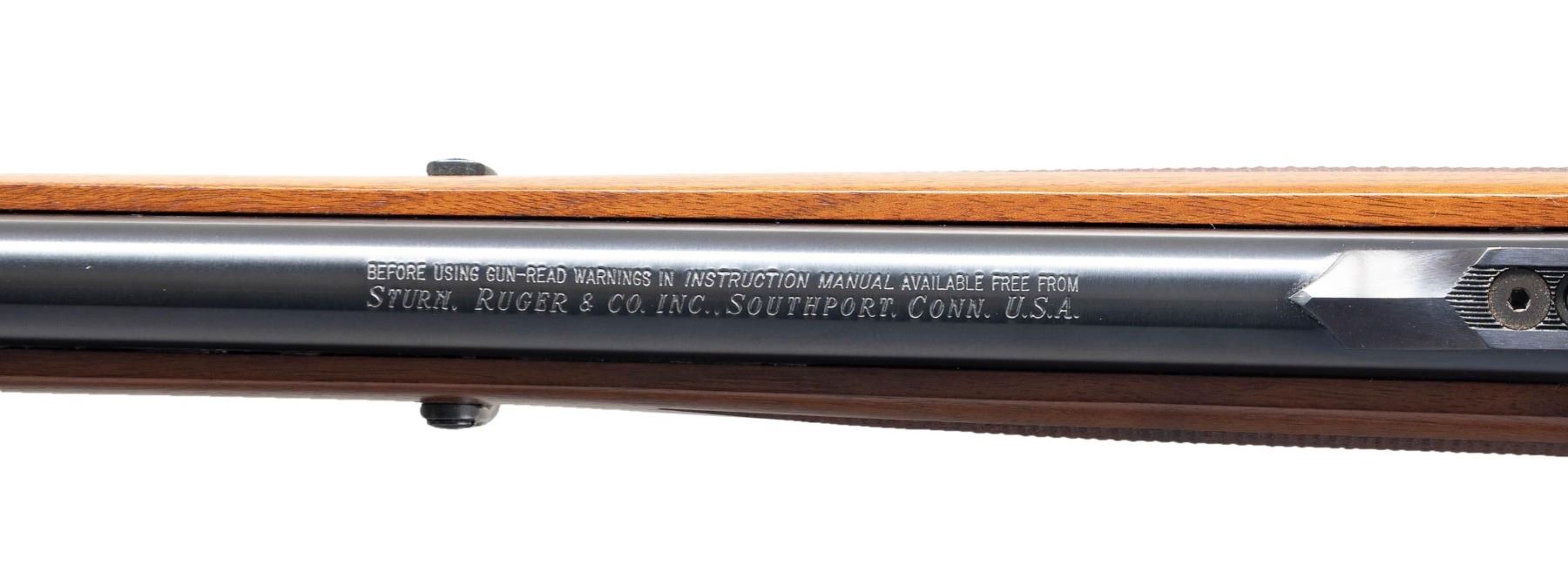Cal. 7X57MM (7MM Mauser). S# 133-74802. Bbl. 20" with ramped banded user changeable brass bead front sight plus quarter rib with factory folding leaf rear sight and NECG receiver sight installed in rear Ruger scope ring position. Mfg. 2000 (1967 to date) as Model 01364 with "warning marks" on barrel (initiated 1977). Mannlicher checkered walnut stock set with black rubber factory pad plus front swivel and base for detachable rear swivel. CONDITION: all aspects near excellent including bore. PROVENANCE: Estate of Groves Herrick. (25-5659/NW). MODERN. $800-1,200.