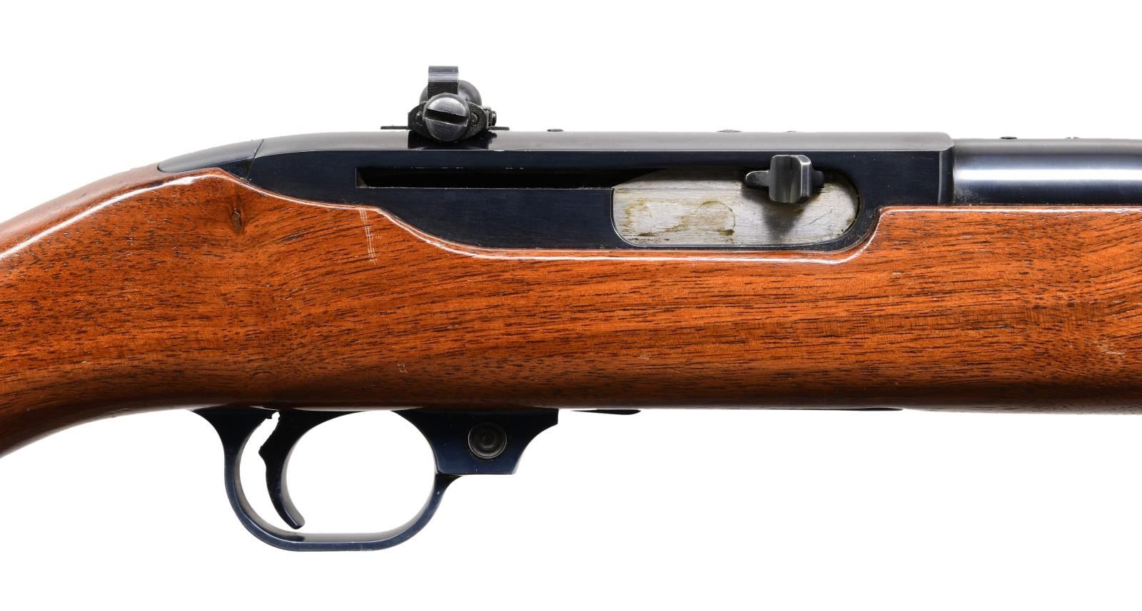 Cal. 44 Mag. S# 535. Bbl. 18 1/2" with earliest sights of sourdough front having white insert plus folding rear with vertical white line; Lyman 66RU on receiver (missing aperture disk). Mfg. 1961 (1961-1985) with distinctive Deerstalker marking (factory designation of 44R) that was discontinued in 1962 to settle lawsuit with Ithaca who used "Deerslayer" for their Model 37 slug barreled shotguns; about 3,900 made before the change. Early features of no "INC." in Southport barrel address and walnut stock with back slant cut at forend plus black anodized aluminum buttplate; non factory swivel set added along with compass at top rear. Earliest example without cartridge release button at loading port plus cartridge guide in top front of receiver held by two screws at front of action; often confused by consumers to be a scope base provision yet factory drilled and tapped at rear of barrel plus rear of receiver for scope mounting. In high demand as compact, fast handling brush hunting carbine that weighs less fully loaded (internal 4 rd. magazine) than the popular lever action carbine weighs empty. CONDITION: very good metal finish with typical light thinning and high edge wear. Stock has numerous light handling marks throughout but no cracks such as in front of loading area or behind recoil block; appears to have extra finish applied. Near excellent bright, shiny bore. (23-6329/NW). CURIO. $800-1,200.