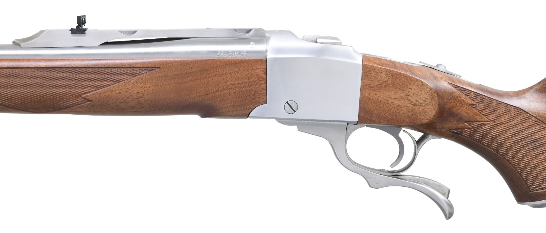 Cal. 250 Savage. S#. 134-34822. 22: rd. Ramp mounted bead front w/ folding leaf rear sight on quarter rib. Stainless steel construction. Alexander Henry forend & capped pistol grip walnut stock have cut checkering, solid black pad & swivel bases. UNATTACHED ACC: original box containing owners manual, warranty card, NRA & offer papers, safety lock & scope rings. CONDITION: as new w/ box. (24-3589/DS). MODERN. $900-1200.
