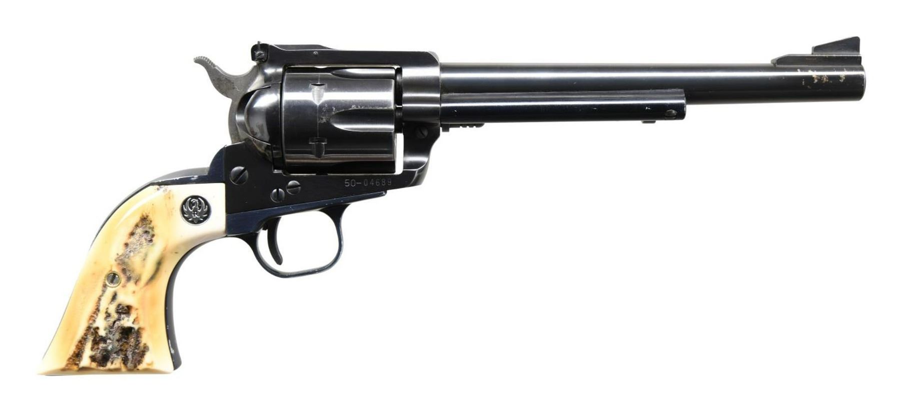 Cal. 30 Carbine. S# 50-04689. Bbl. 7 1/2" with ramped serrated blade sight plus frame mounted adjustable rear. Black anodized alloy grip frame and ejector housing. Realistic looking non Ruger, faux stag grips with newer silver eagle medallions added. Mfg. 1969 (1968-1973) having firing pin groove on rear of cylinder. Not fitted with factory safety update conversion. Very desirable caliber Old Model Blackhawk. CONDITION: very good overall having some very light high point thinning (and light scratches) showing mainly at muzzle along with spots of cleaned oxidation. Faint cylinder turn line plus light staining on sides of hammer and wear mark on butt.. Near excellent bore and grips. PROVENANCE: The Collection of Gun Sport Ltd owned by Jon R. Thomas. (23-3959/NW). CURIO. $500-750.