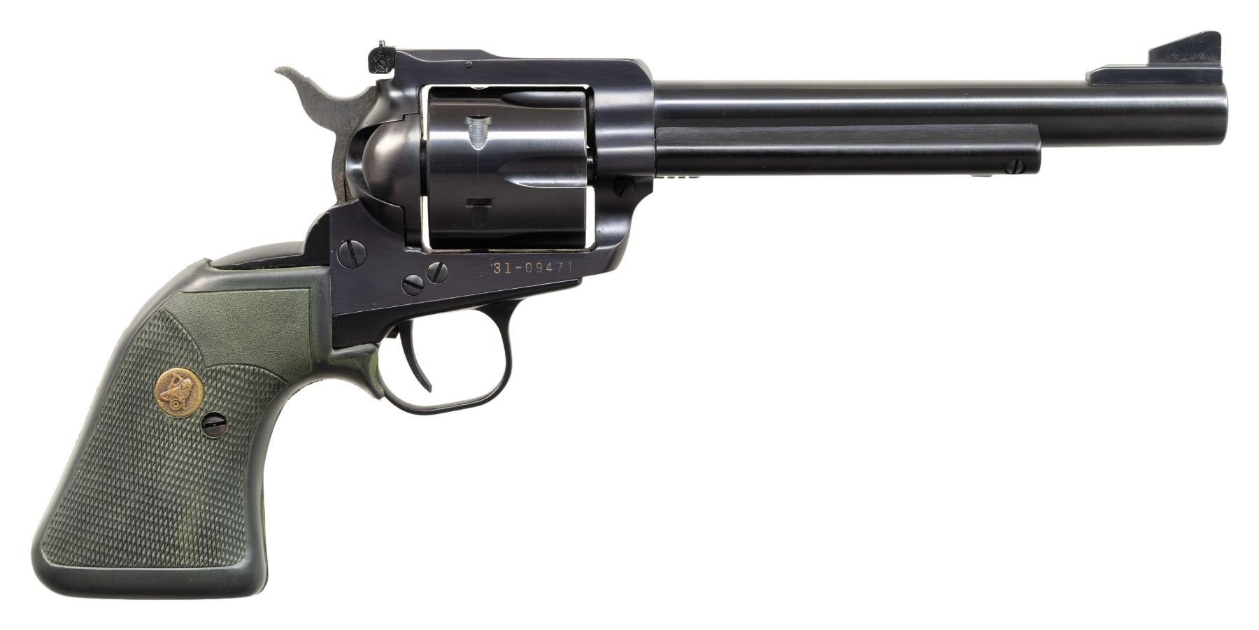 Cal. 357 Mag. S# 31-09471. Bbl. 6 1/2" with ramped base having ramped serrated blade front sight; frame mounted factory adjustable rear sight. Mfg. 1971 (1962-1973) as BN36 having protective "ears" for rear sight that added strength to the top strap as compared to the previous generation of Flat Top Blackhawks. Returned to factory for the safety recall and is fitted with the new transfer bar parts; original parts included. Fitted with Pachmayr Signature rubber grips. Fully refinished by the factory with the addition of Bonanza Gold in its markings. UNATTACHED ACCESSORIES: recall box with end notation that this was a convertible model; no 9mm Luger cylinder. Has Old Model parts set and safety conversion manual. CONDITION: all aspects near excellent including bore and grips; appears new. (25-4875/NW). CURIO. $300-450.