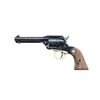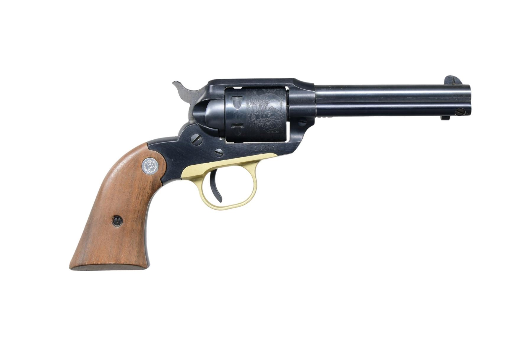Cal. .22 LR. S# 102141. Manufactured by Sturm, Ruger & Co. from 1958 to 1970. Features a blued finish with an engraved cylinder and brass trigger guard. Barrel length is 4 inches. The front sight is a ramped blade and the rear sight is a groove. It has a standard trigger and a spurred hammer. The cylinder is not fluted and holds six rounds. The grips are smooth walnut with Ruger medallions. CONDITION: Overall condition is very good with approximately 90% of the original blued finish remaining on the barrel and frame. The grips show minor handling marks. The bore is bright with strong rifling. CURIO (23-6721) $400-600.