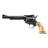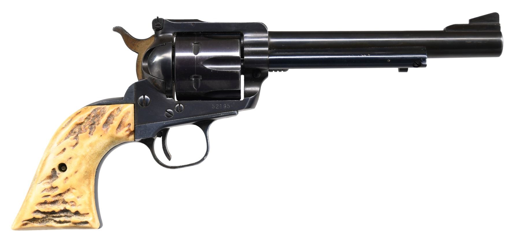 Cal. 357 Mag. S# 52195. Bbl. 6 1/2" with a serrated blade on a ramped base; frame-mounted adjustable rear. Mfg. 1963 (1962–1973) as a protected sight variation with catalog number BKH-36. Has not had a safety update installed and is fitted with hand-filling stag grips. Barrel without "Inc." in the address; alloy ejector housing. CONDITION: good to very good general appearance with factory quality refinish having some missing spots along with occasional high edge wear plus light cylinder turn line. Stained sides of the hammer, plus light marks on the trigger guard and slight impact marks on the butt. Near-excellent bore, and the grips have deep canyons. (23-6274/NW). CURIO. $300-450.